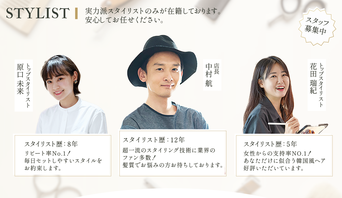 スタイリストは皆、モデル御用達の有名店で腕を磨いた実力派。