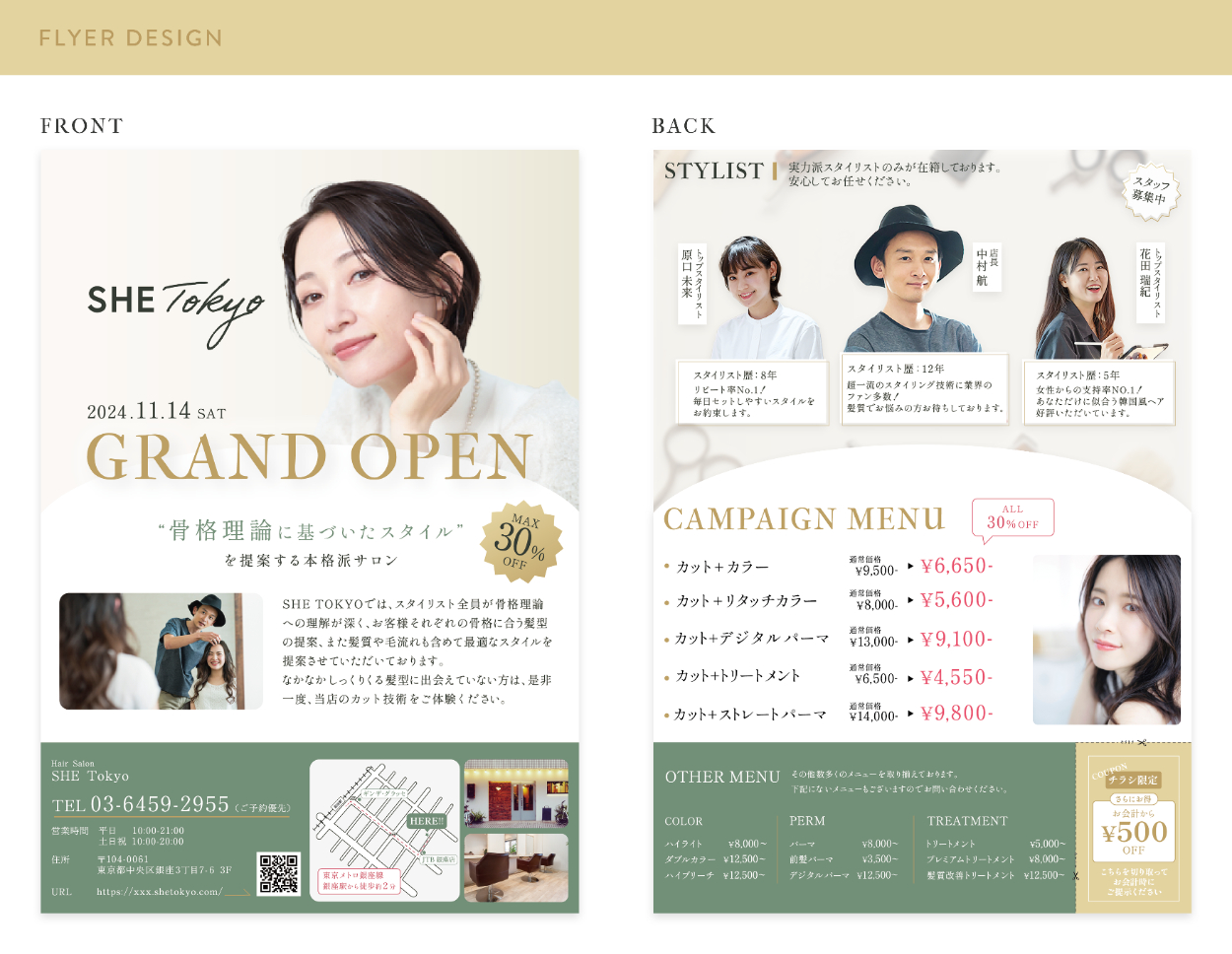 表と裏面で、色味やあしらいを統一することでまとまりがあるチラシになっていると感じた。