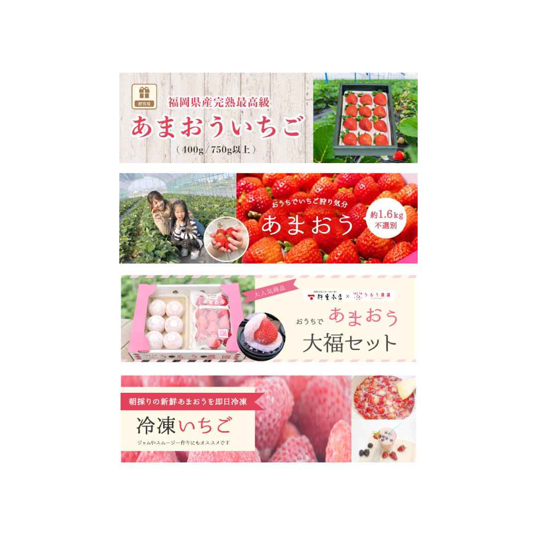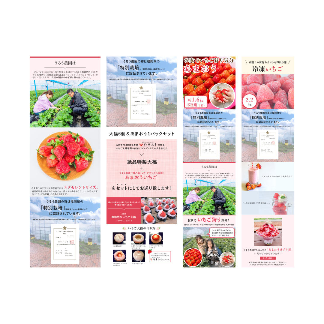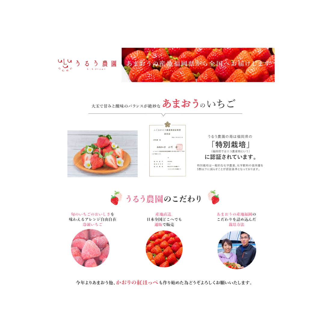 design / 産直感、フレッシュ感を出したいとのご要望でしたので苺のフレッシュ感を全面に出すために苺の画像を主にして、全面的にフレッシュ感を出させて頂きました。また、産直感を出すために土作りからこだわっている背景をサイトに掲載させて頂きうるう農園様のこだわりをアピールしたデザインにさせて頂きました。