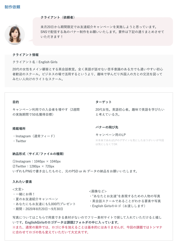 実際の案件を想定したバナーの制作課題 クライアントから案件を受け取ったことをイメージしながら制作をして、ユーザーストーリーを考えながら情報設計やビジュアルデザインをする。