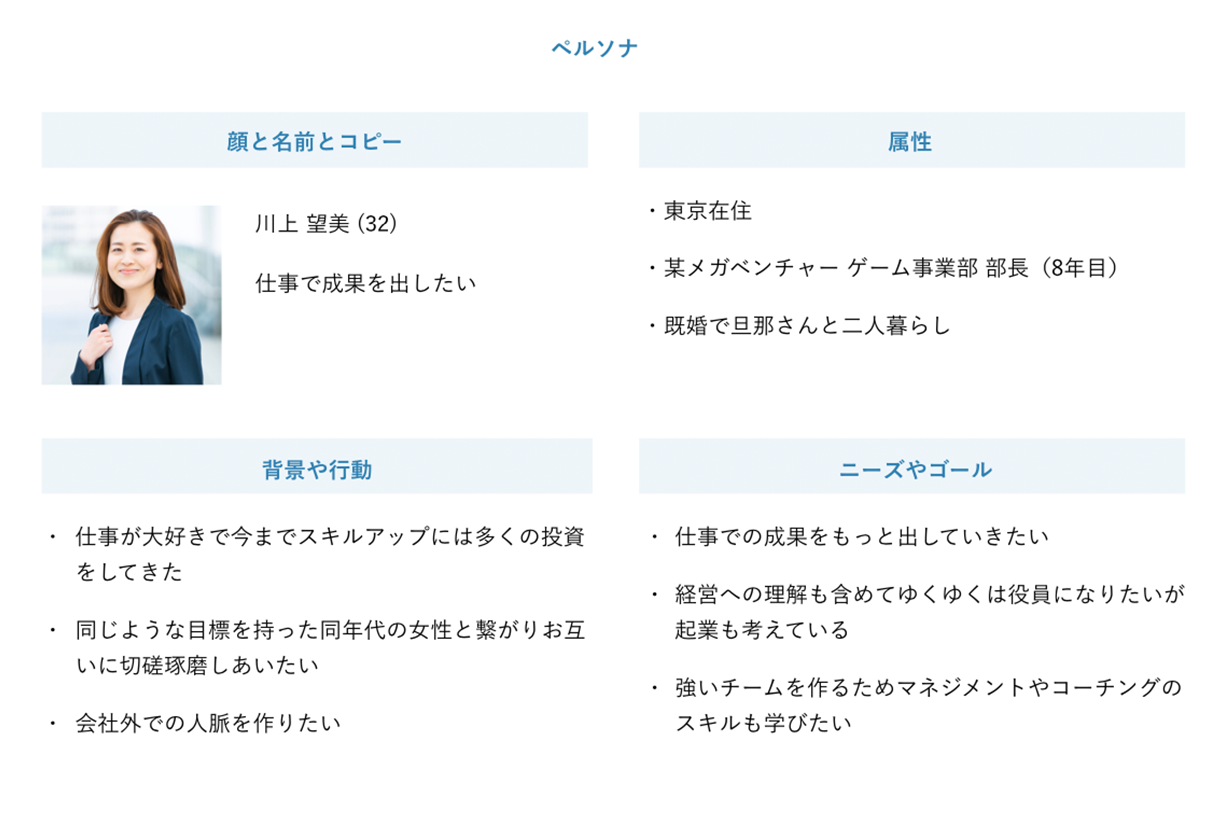女性向けのビジネススクールを展開。会員は20~30代の女性が多く、キャリアアップのためにビ ジネススキルを学び、さらにそのアウトプットの場として定期的にビジネスコンテストなどのイベントも 開催されている。