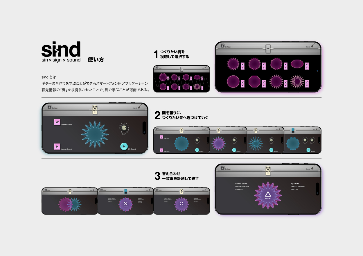 ギターは始めやすいが、同時に辞めやすい楽器でもある。その原因を、頭の中の音色が出せないこと(=成功体験がないこと)にあると仮定した。解決手法として、視覚情報と聴覚情報を基に、ギターの音色を変化させるアイテム「エフェクター」の使い方を学ぶことができるアプリケーションを制作した。