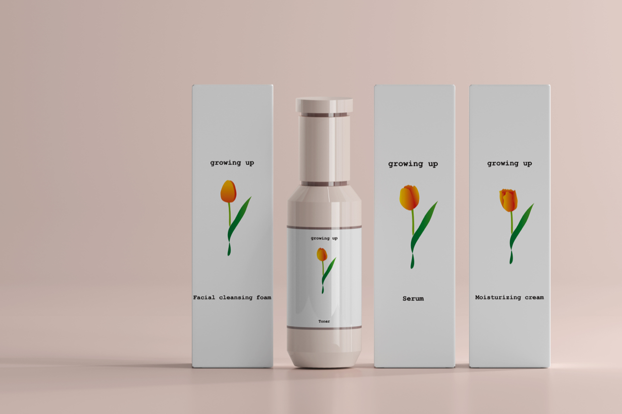 growing up Hinano デザイナー OVERVIEW 架空化粧品パッケージ スキンケアラインのパッケージを作成いたしました。清潔感のある、優しく女性らしいパッケージ洗顔フォームから最後の仕上げのクリームに満開になっていくイメージで、女性が綺麗になっていく様子を表しています。