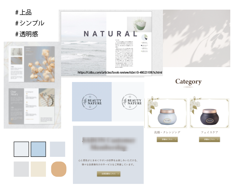 銀座という場所柄、落ち着いた大人の女性であり、派手ではないが上品で品のある華やかさがある印象を持ち、ムードボードを作成しました。
