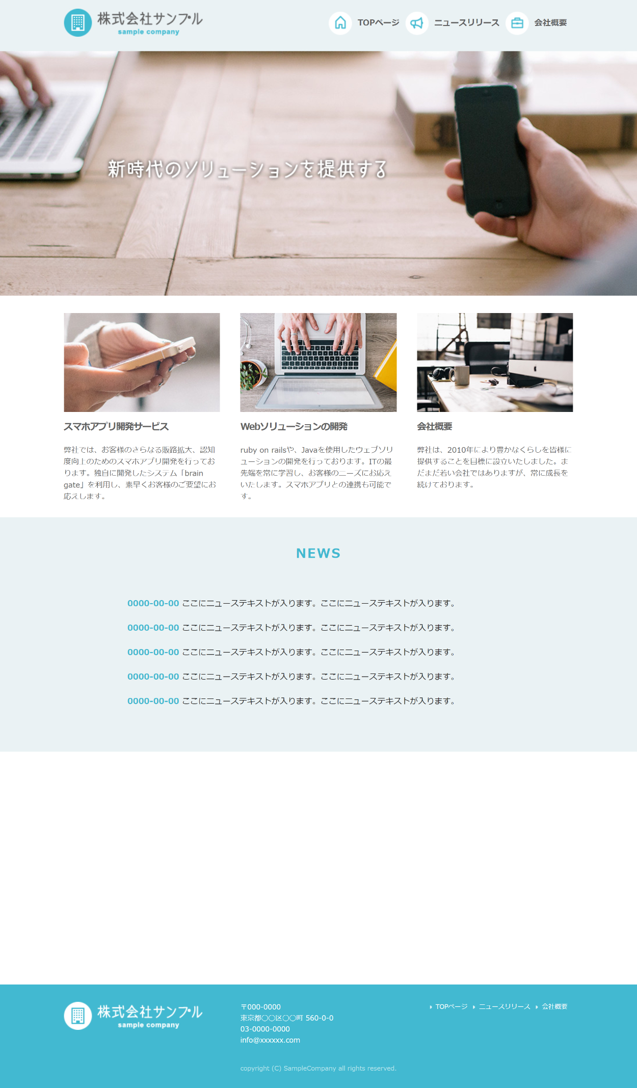 株式会社サンプル mori anri Webデザイン、コーディング OVERVIEW プログラミングスクールにて課題として作成。Skeletonを使用。 YEAR 2020 スクールの課題として作成。CSSフレームワークSkeletonを利用し、架空コーポレートサイトを作成。デザインカンプをもとに、ズレがなくコーディングをする技術を学びました。