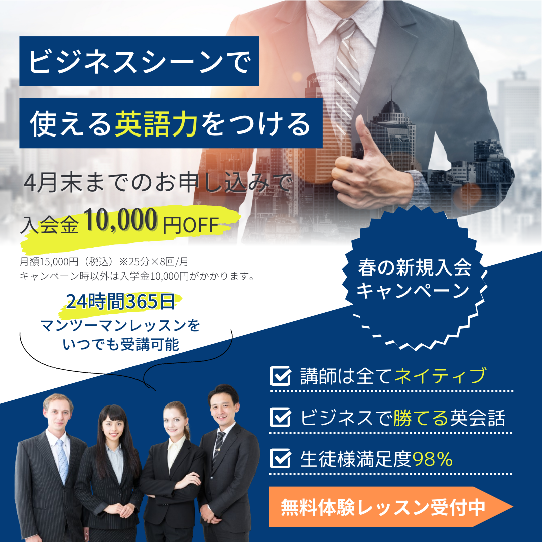 英会話スクールの新規入会キャンペーン ayumi9392 Webデザイナー OVERVIEW オンライン英会話スクールの入会誘導バナー 外資系企業に勤務されている30代後半〜40代の男性がターゲット。 英語でのミーティングや商談にもっと自信を持ちたいと考えており、仕事が忙しいため、いつでも好きな時間に受講できるようなスクールを探している方に向けて制作しました。