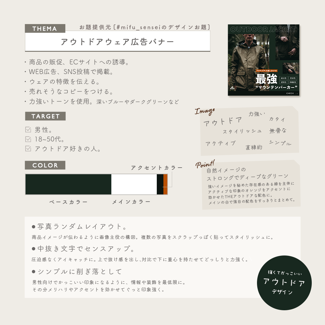 【自主制作】アウトドアウェア広告バナー KEIKO UEDA デザイナー/イラストレーター OVERVIEW 24.6.11/制作時間:3時間/制作ツール:Illustrator/コンセプト:強くてカッコいいアウトドアデザイン YEAR 2024