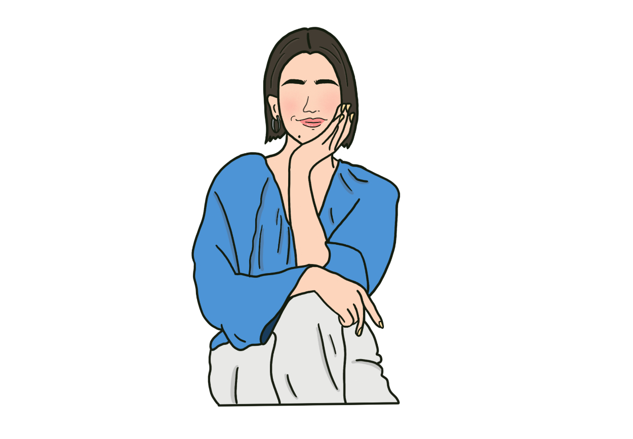 サロンオーナー様ということで、上品さの感じられる雰囲気のイラストを描きたいと思い、表情の色味や艶感を意識し、足を組んで頬に手を当てているポーズと合わせて描きました。