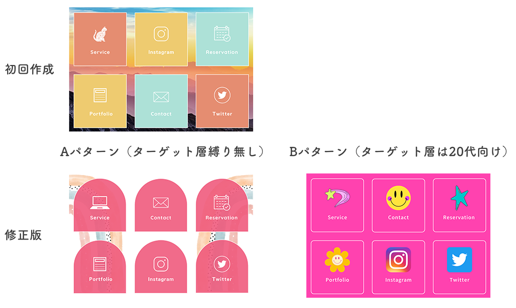 当初は山のサービス展開(登山ガイド)も考えており、山の写真を背景としていたが、「POP STEP JUMP」のフレーズとは合わないとキャリアスクール同期やコーチから指摘があったためカラフルでポップなデザインに修正。また、初回のデザインでは大好きな猫のモチーフをサービス一覧のボタンに入れていたが、少しクールでテイストが他のアイコンとは違うので統一感があるアイコンに修正。