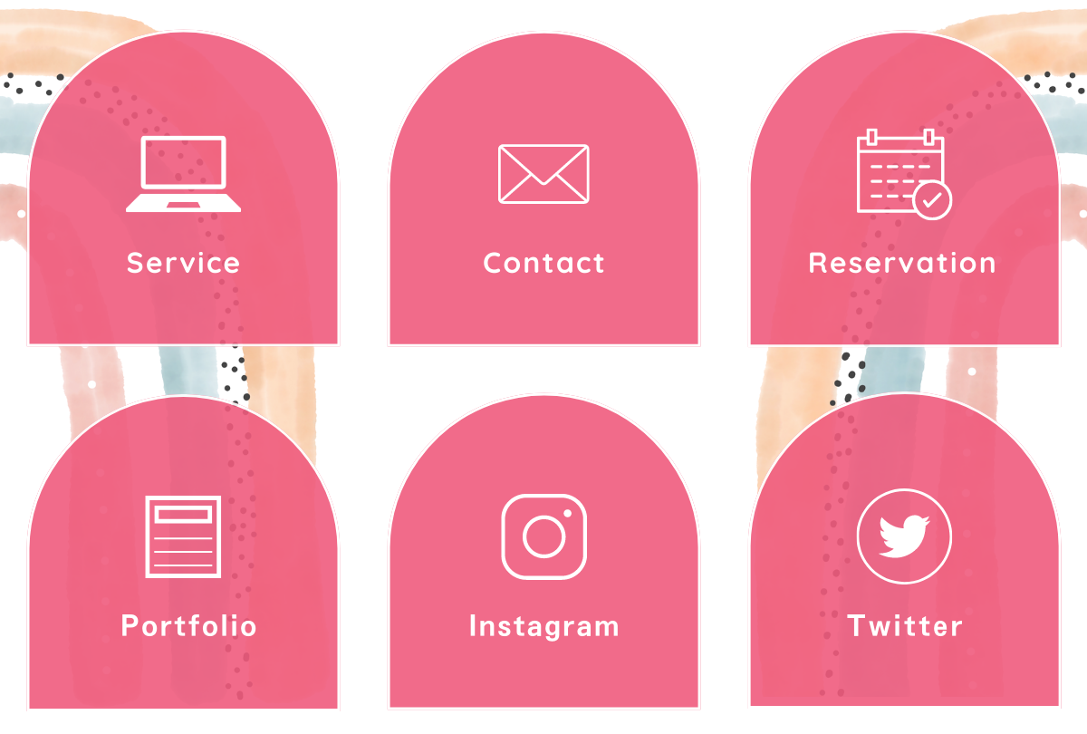 ◆必要な記載事項:ポートフォリオ、Instagram、Twitter、お問合せボタン、スケジュール予約ボタン、サービス一覧ボタンの6個のボタンを入れる。
