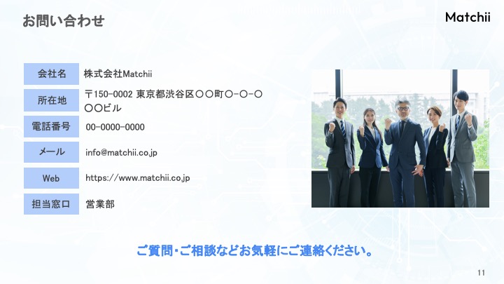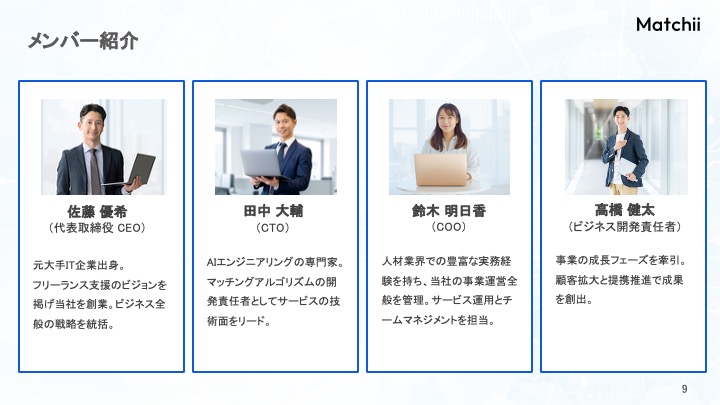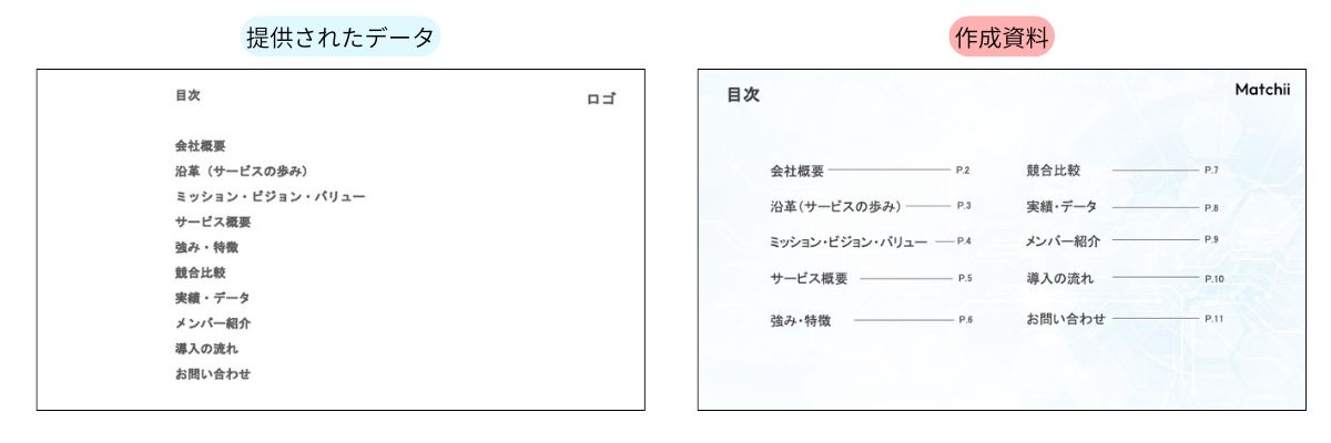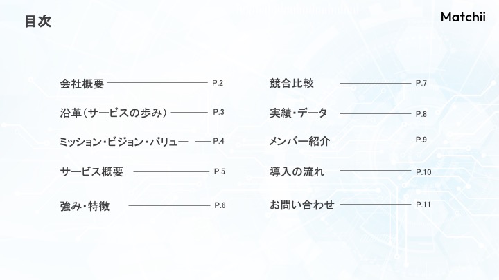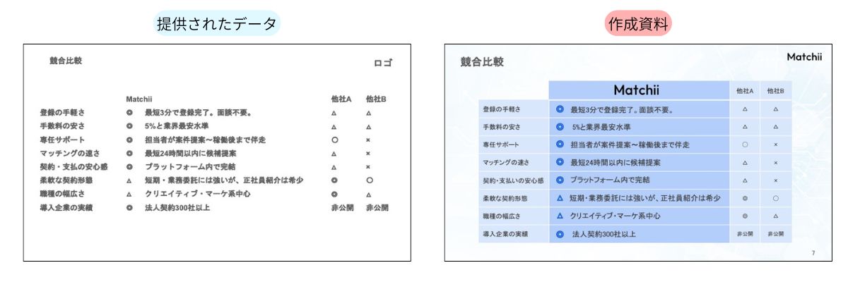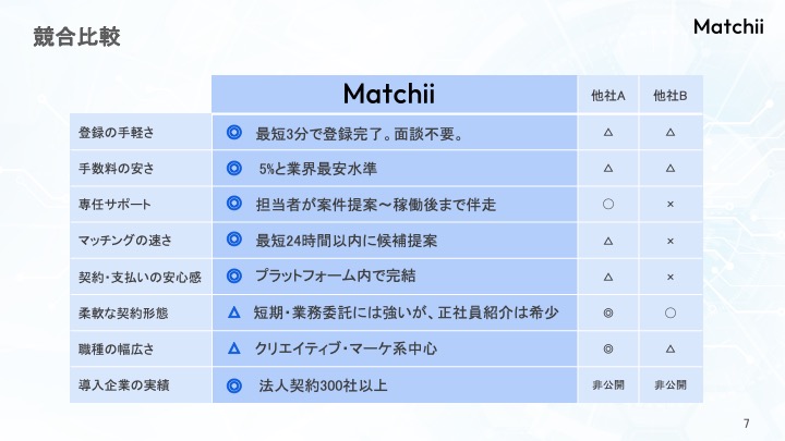 自社(Matchii)の列をカラーで強調し、他社との違いを明確化。整然とした表組みにより、データの客観性と信頼性をアピールしています。