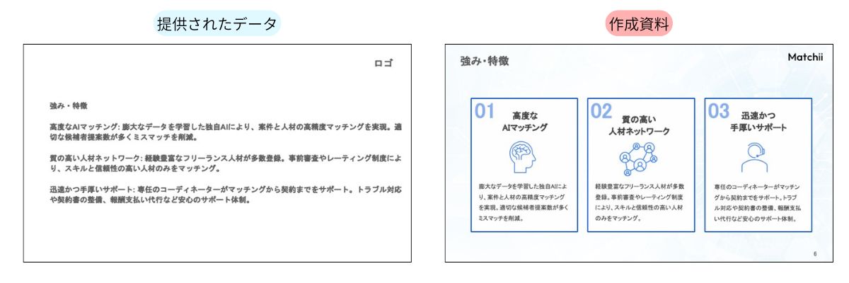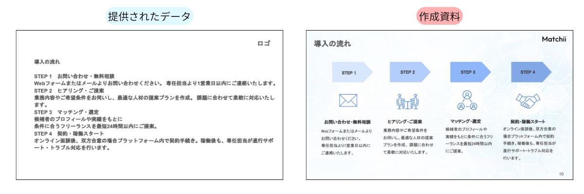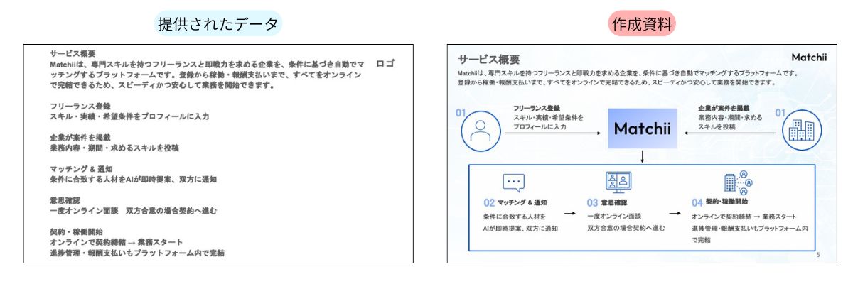 • 文章だけでは理解に時間がかかるサービス内容やステップ図を、アイコンやフローを用いることで「直感的に伝わるビジュアル」へ変換するスキルの大切さを実感しました。
