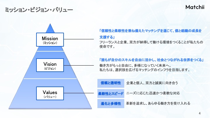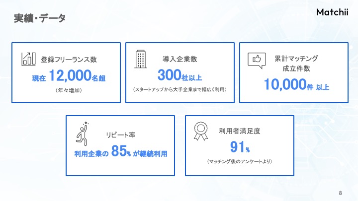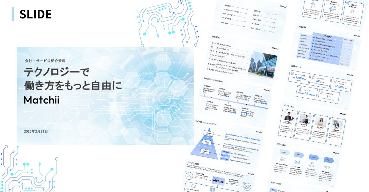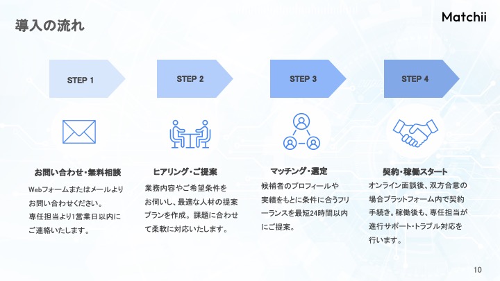 「企業」と「フリーランス」がMatchiiを介してどのようにつながるのかを、フロー図で表現しました。複雑なマッチングの仕組みをシンプルなアイコンと矢印に置き換えることで、説明なしでもサービスモデルが理解できる設計にしています。