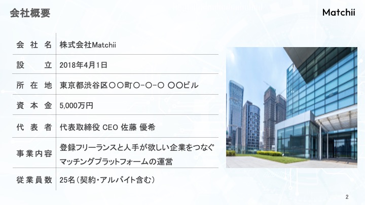 企業の人事・経営層に向けて自社サービスを説明し、マッチングプラットフォームの導入を検討してもらうための資料