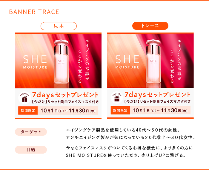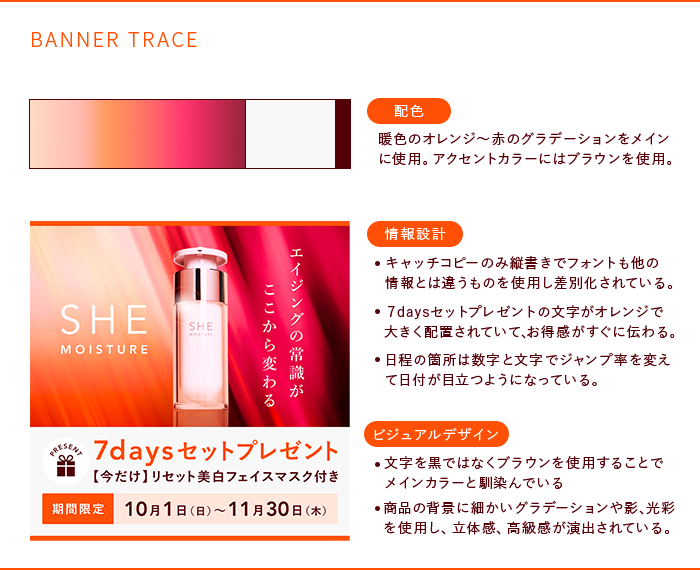 スクールの課題でバナートレースをしました。既存のバナーをトレースし、分析とデザインの観察をまとめました。(制作時間 120分)
