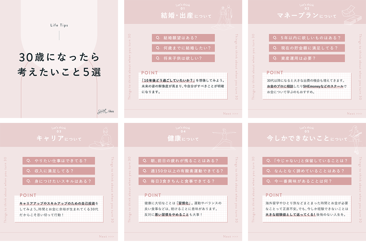 ・働く女性をメインターゲットとしたSHElikesのトンマナに合わせ、シンプルかつスッキリとしたデザインにしました。