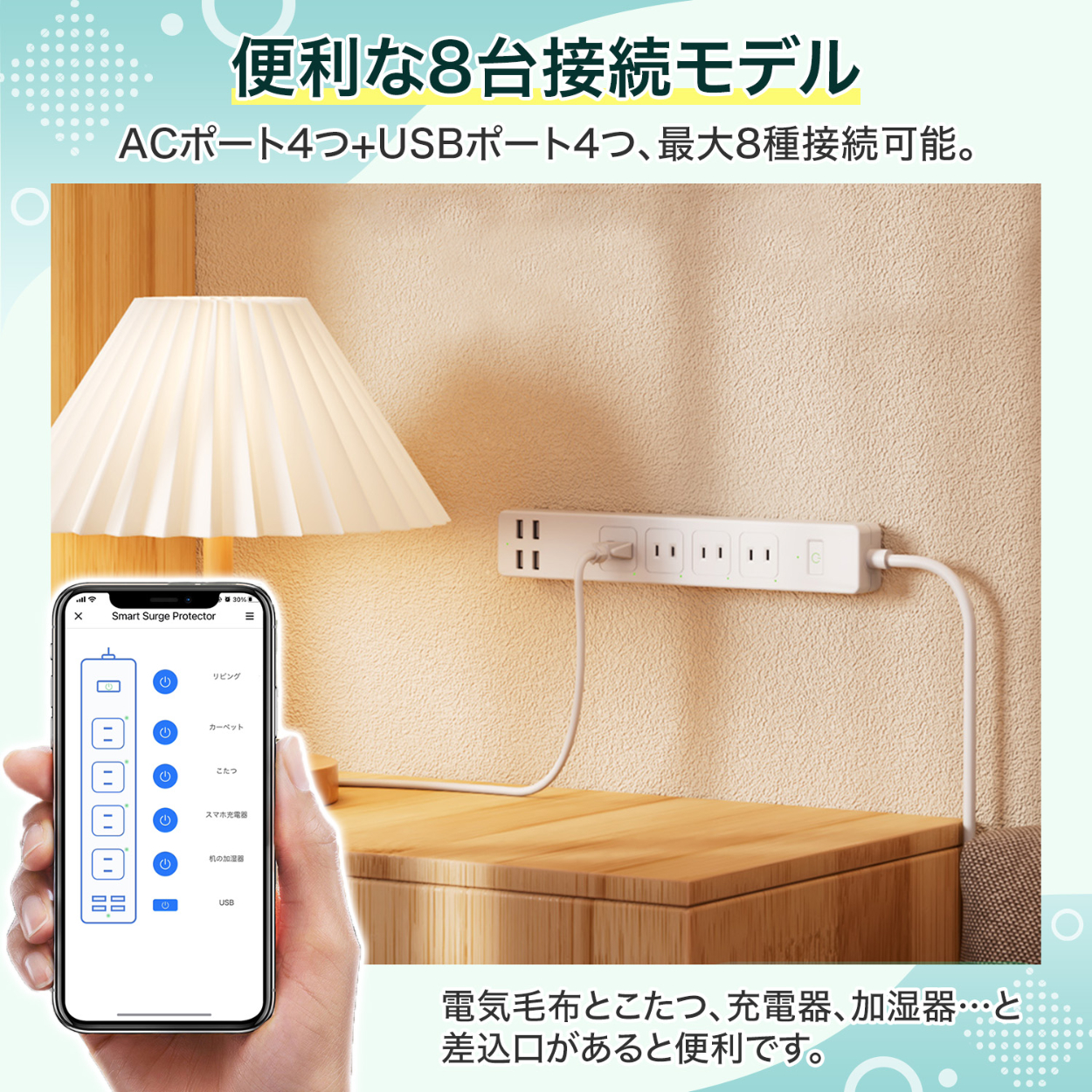 スマート電源タップの商品画像 yoko フリーランスWebデザイナー ECサイト(楽天市場)で使用されるスマート電源タップの商品画像を制作ターゲット:30代〜40代 男性・女性使用ツール:Photoshop・Illustrator