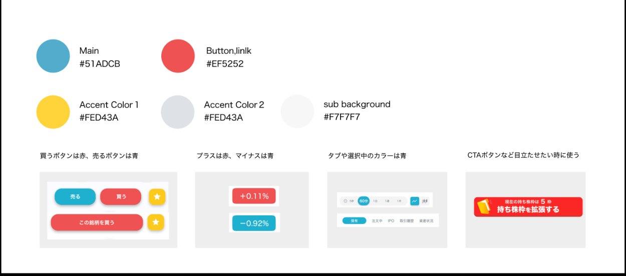 ビジュアル的には全体的な方向性は変えずに、もう少し 洗練されたイメージにすることがゴールでした。 以前のトンマナだと明るい赤が、アプリの怪しさをより強調してしまっていたので、赤ではなく水色をメインのカラーとして使用し、赤は反対色として売るボタンなど一部に使用しました。そうすることで、大きく変えずに、全体的に洗練された印象を感じられるビジュアルになりました。