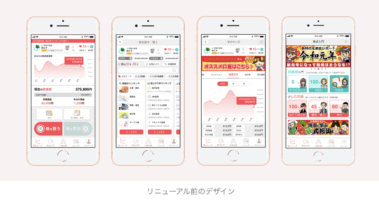 株たすは、株式投資のデモトレードが体験できる投資体験アプリです。“本物“の株価データを使用したチャートで、限りなく本番に近い株の投資シミュレーションが体験できます。アプリ内からユーザーが口座開設すると、売上の一部が報酬として還元される仕組みです。そのため、ユーザーにデモトレードで成功体験を掴んでもらい口座開設まで促す必要があります。 3番目のデザイナーとして入社し、プロダクトの改善を行いました。