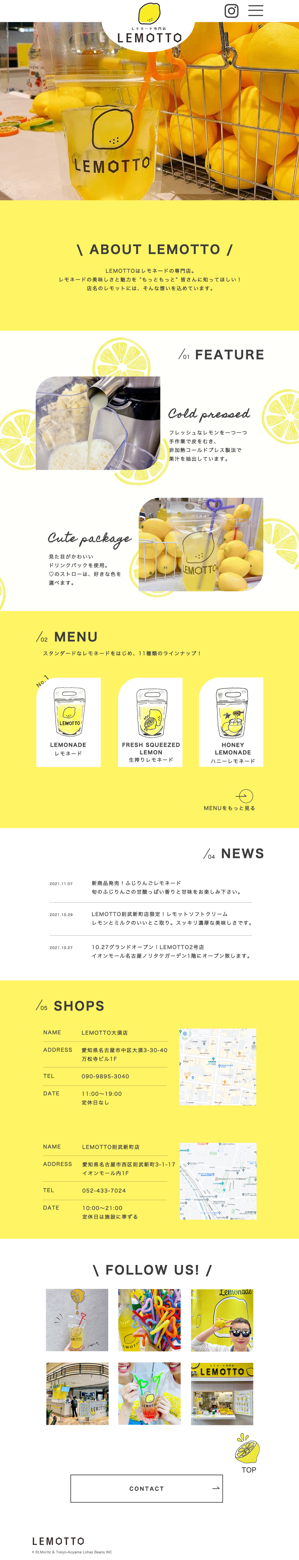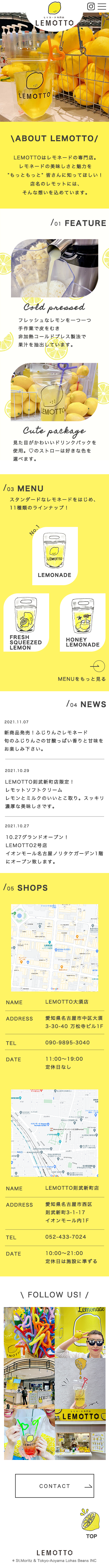 ■コンセプト:ターゲットは約70%が若い女性のためポップでかわいいデザインイメージに設定。気軽に立ち寄れるレモネード店のイメージのため華美なデザインではなくナチュラルかつポップでかわいいデザインを意識。「明るい配色で、レモネードを身近に感じて欲しい」というクライアントの要望から、レモネードを連想させる黄色のビタミンカラーで色数は少なくシンプルにまとめ、親しみやすさを出した。レモンのイメージからメインカラーには(#fff464)を使用。所々に動的なデザインを入れ、ユーザーがHPを見ていて飽きさせない工夫を施した。