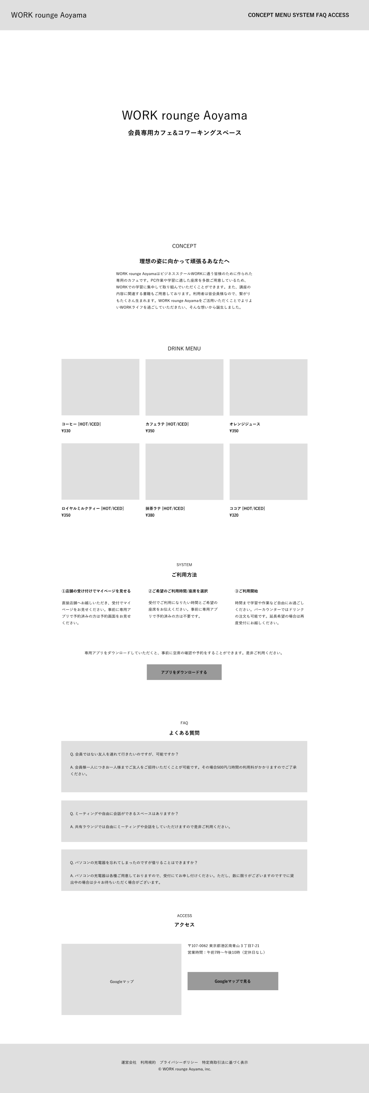 架空のコワーキングスペースのワイヤーフレームからデザインカンプを制作しました。
