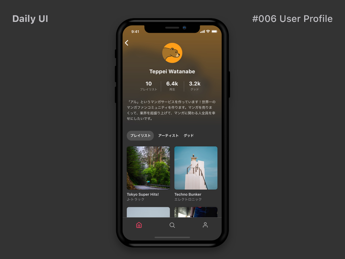 プレイリストに特化した音楽アプリのプロフィールページです。プレイリストが主体のため、ユーザーのフォロー機能はなく、プレイリストにグッドをすることであとで見返すことが可能です。