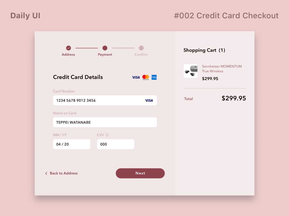 2日目はECサイトのクレジットカード決済画面のデザインです。全体を赤系の色で統一しました(特に意味はありません...)ページを左右に分け、右にショッピングカートを表示することで何の購入をしているのか分かるようにしています。