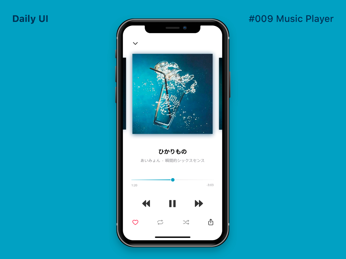 いたって普通の音楽アプリの再生画面です。アートワークを左右にスワイプすると曲を切り替えることができます。