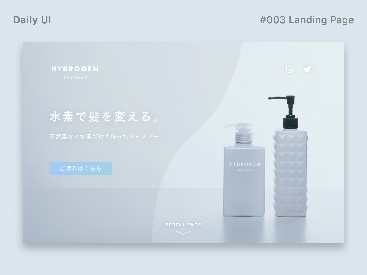「もしも水素水がシャンプーになったら...」という想像から作った架空のシャンプーのLPです。ボタニストのようなシンプルで洗練された、体に優しいイメージが理想だったのですが、ニュートラルな雰囲気を出したいあまり「誰をターゲットにしているのか分からない」デザインとなってしまいました。