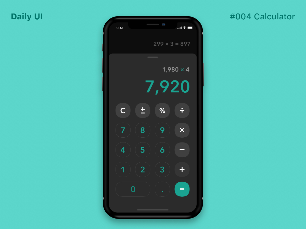 こちらの電卓アプリは、iOS純正のマップアプリの様なハーフモーダルを用いて、手前に電卓、奥には履歴を残すデザインにしました。入力ボタンの形は円でも角丸でもなく、一から作成しています。