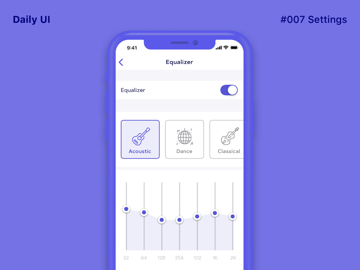 音楽再生アプリのイコライザ設定ページです。基本的に設定ページはシンプルで分かりやすいUIを求められるので、少し工夫をしようとしたせいで無駄に時間をかけてしまいました。