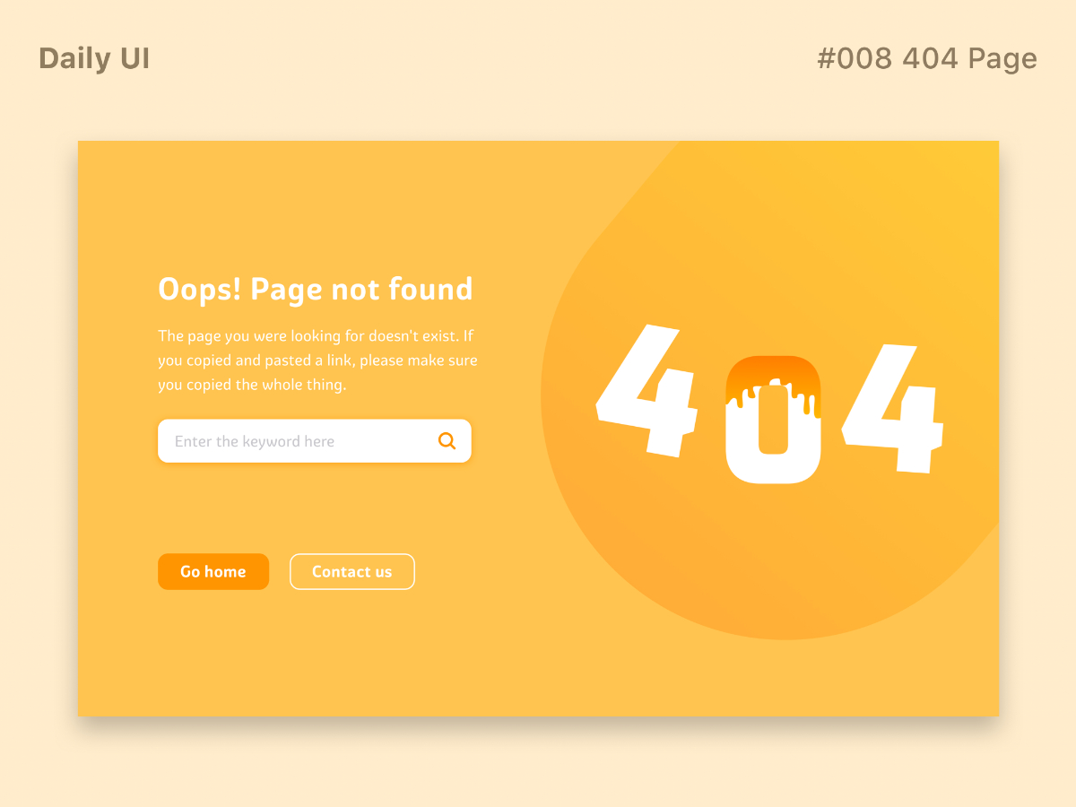 404ページのデザインを検索すると、凝ったイラストを使ったものが多く、僕には難しいと思ったので、404の文字と絵の具が垂れるイラストを使ってそれっぽく見せました。このページはあくまでもエラーが起きたユーザーに次のアクションを誘導する目的で表示するものなので、左には「検索バー」「ホームへ戻る」「お問い合わせ」ボタンを設置しました。