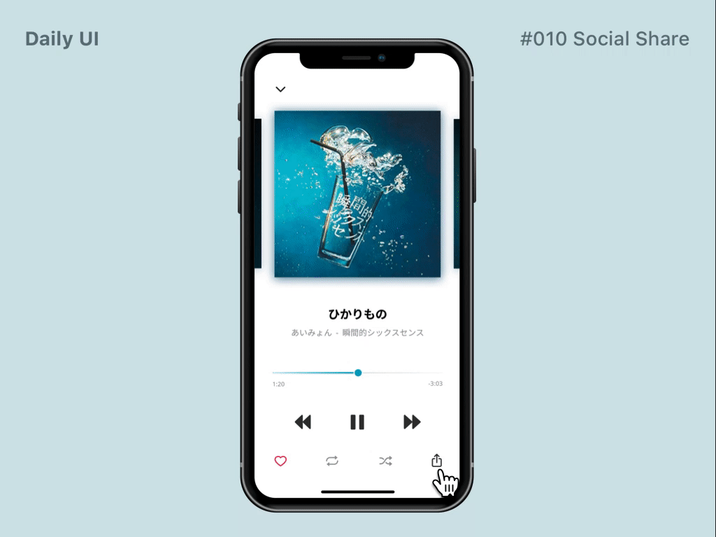 010のデザインを用いてシェアするまでのインタラクションを作りました。単純な動きですが、TwitterやInstagramのアカウント切り替えモーダルを参考に、滑らかな動きになるようアニメーションの調節をしました。