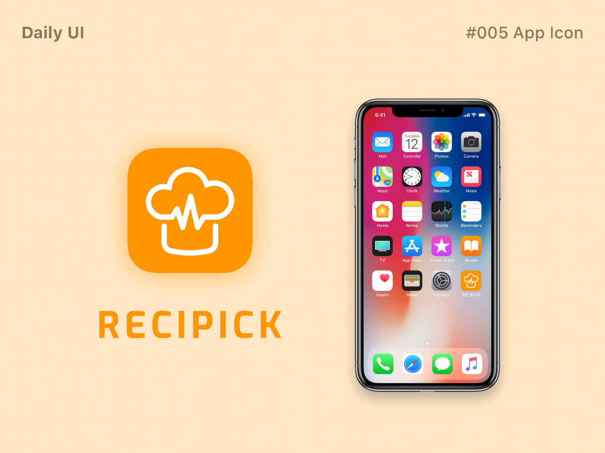 iPhoneに記録されたヘルスケアデータを利用してその日の体調に最適なレシピを提案する架空のアプリ、「RECIPICK」のロゴです。Sketchで作成しました。料理の「コック帽」とヘルスケアデータの「心拍」をモチーフとしています。