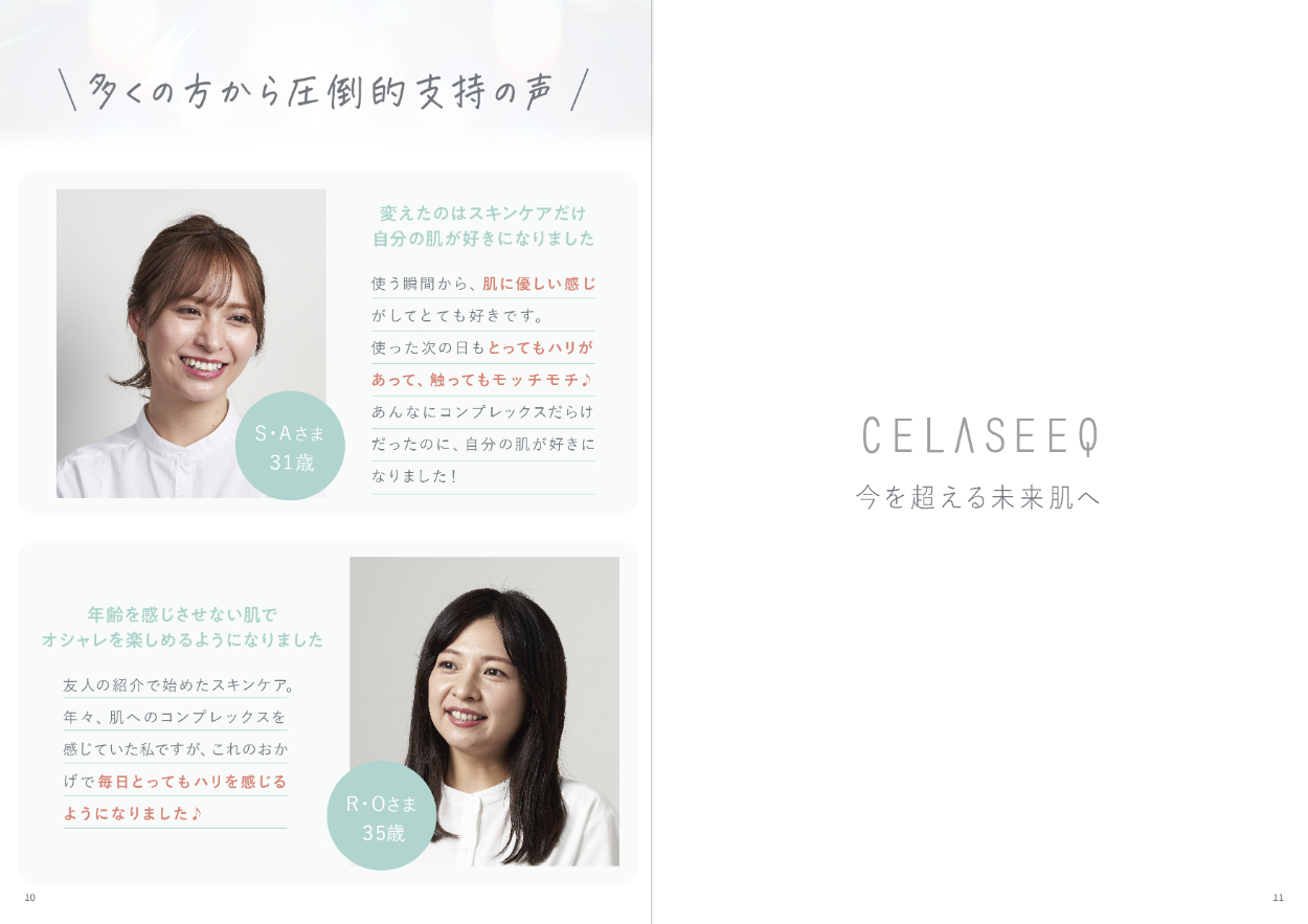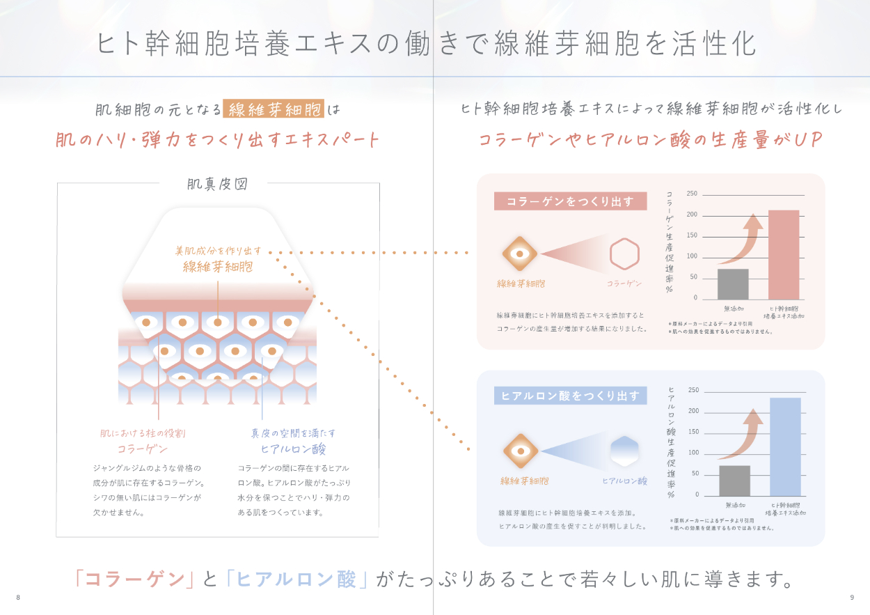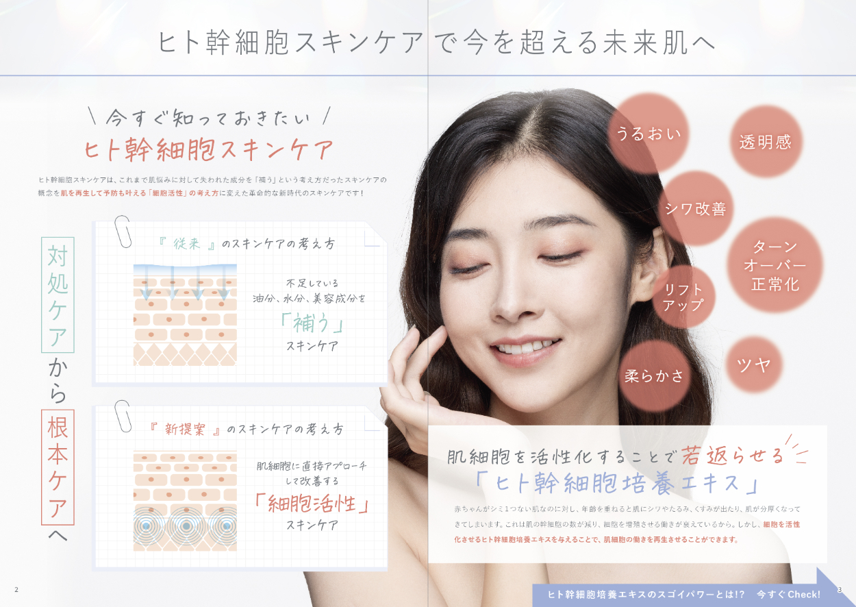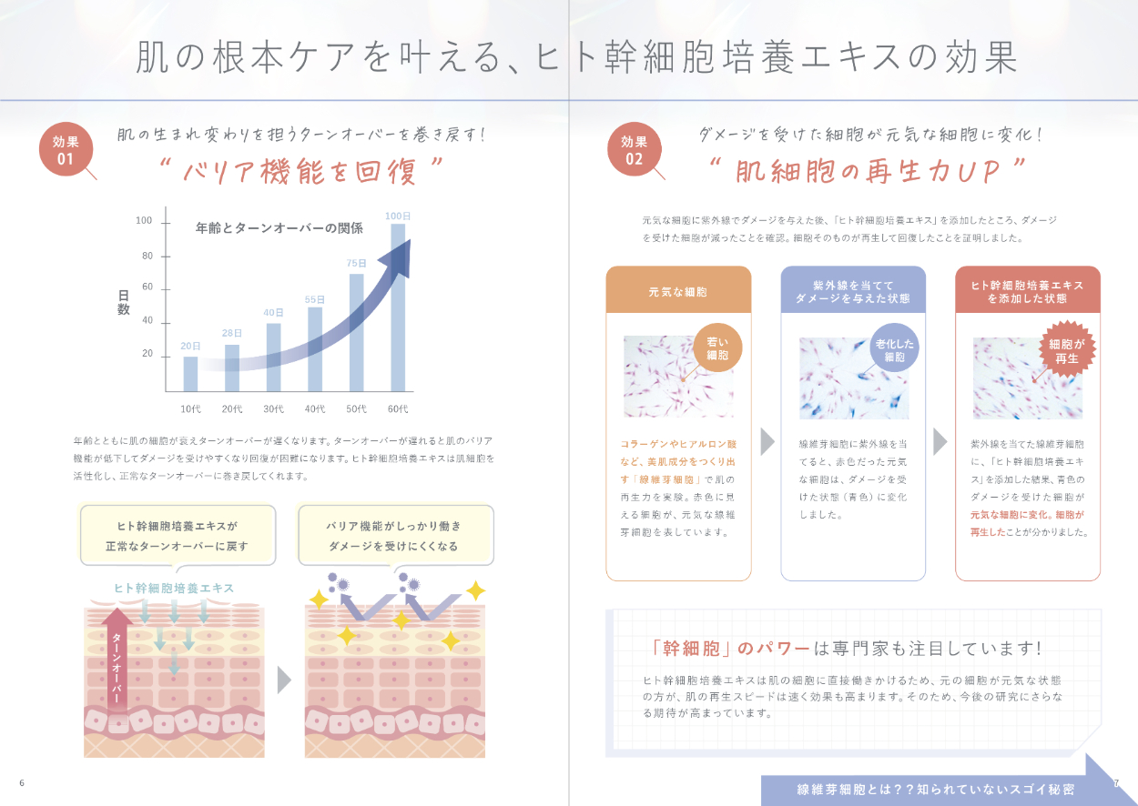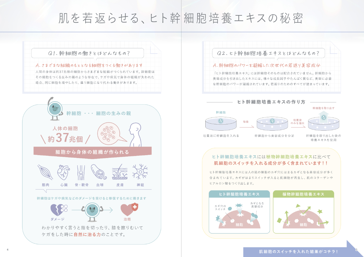タイムレスリペアシリーズの主要成分、ヒト幹細胞培養液とはどのような成分なのかを詳しく記載した同梱物。商品を安心して使って頂けるよう効果や仕組みをわかりやすくデザインした。