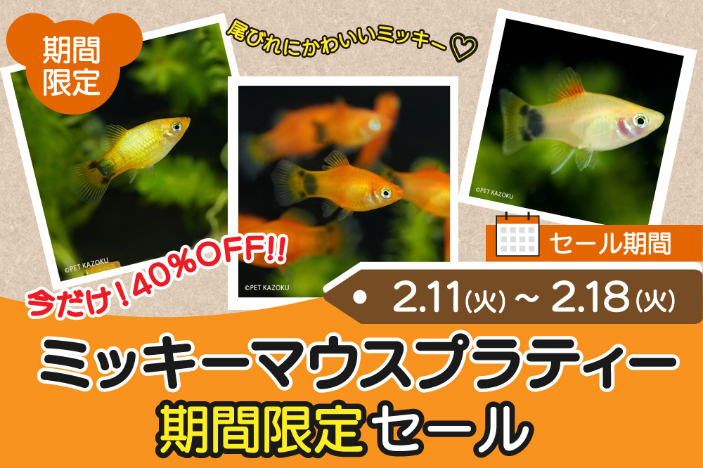 ④期間限定!ミッキーマウスプラティのセールバナー。知っている方は知っていますが、尾びれの部分がミッキーの形をしている可愛い個体でしたので、ミッキーのマークを期間限定に入れて、可愛らしさ、且つセールという点も考慮して制作させていただきました。