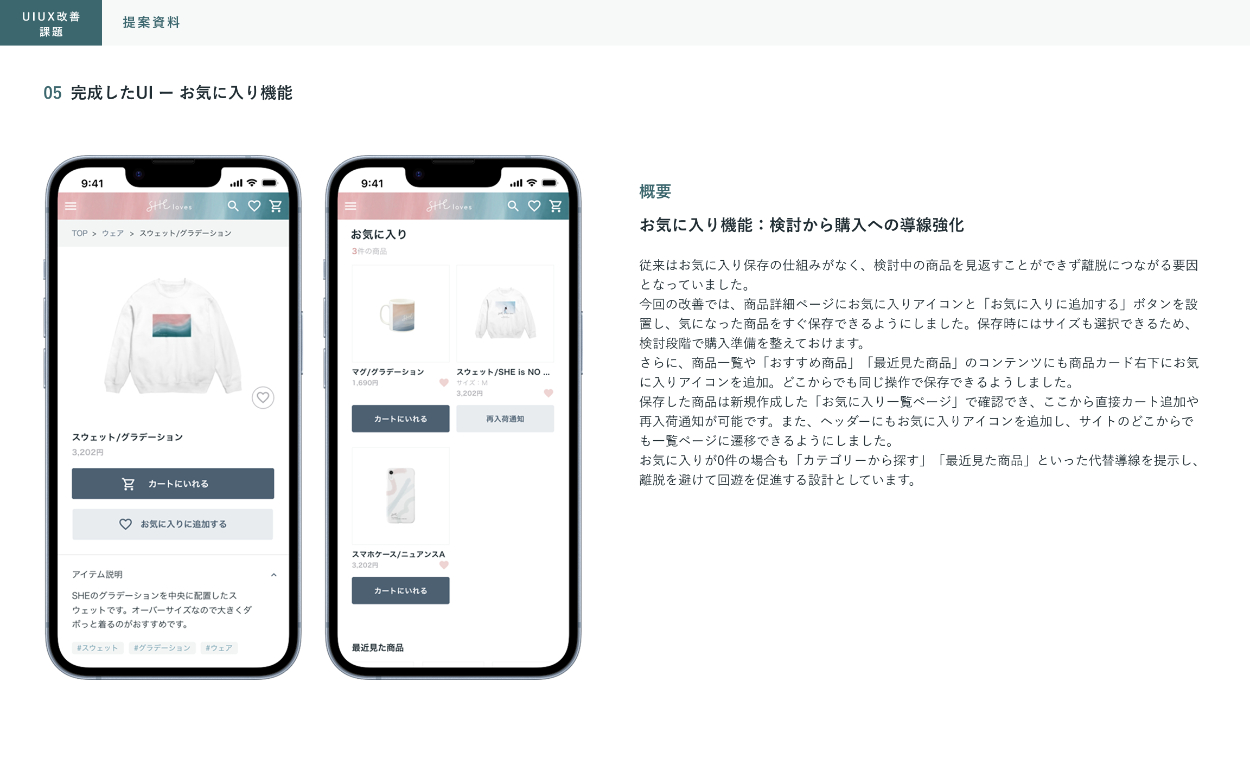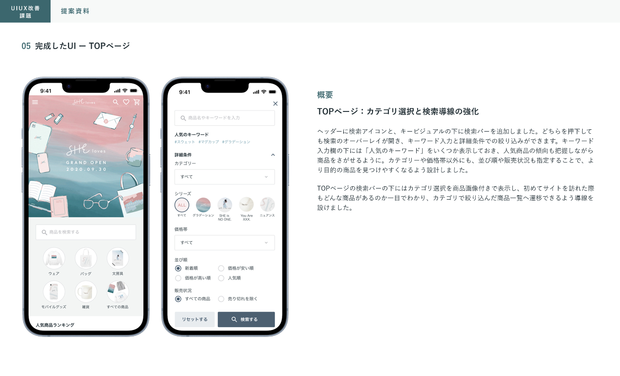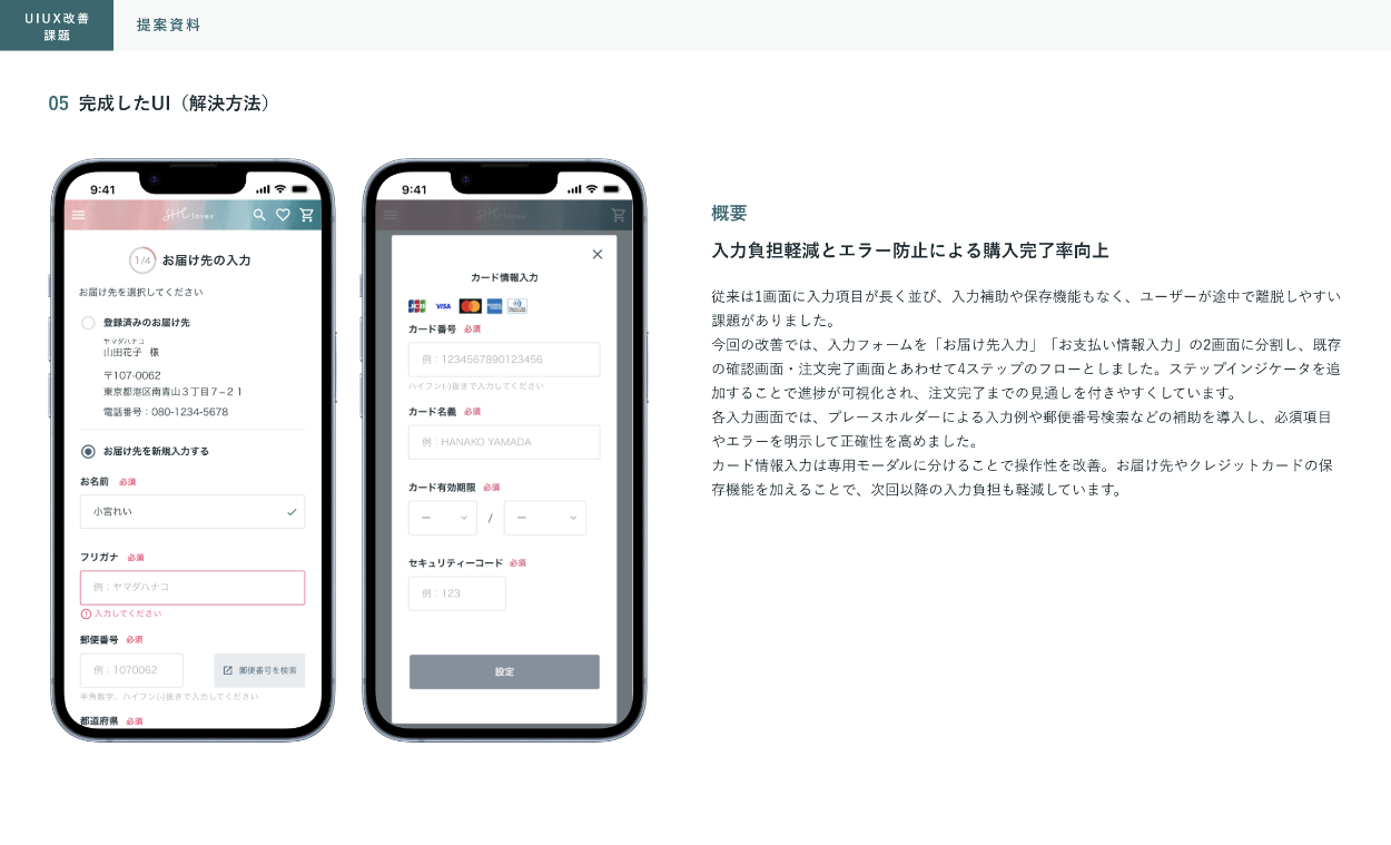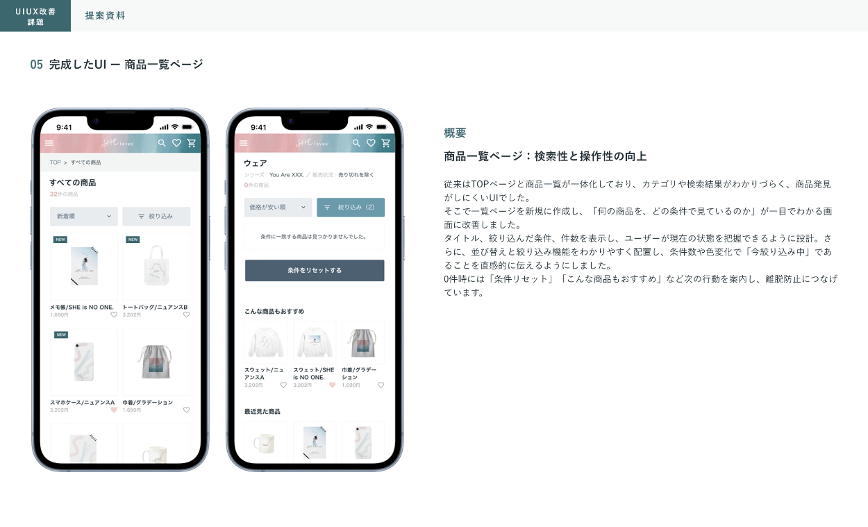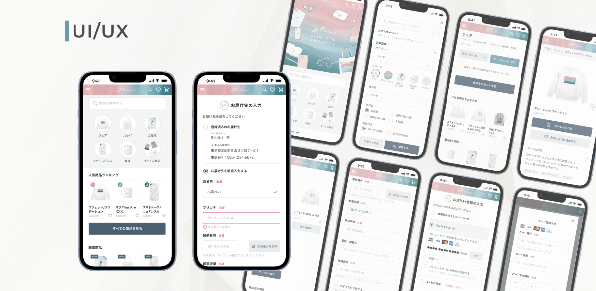 SHElikes PRO デザイナーコースの課題。 「入力フォームで途中離脱が多い」「ほしい商品が見つけづらく離脱してしまう」というECサイトの課題に対し、要因を分析し、UI/UX改善を行いました。Figmaでのプロトタイプ作成と提案資料へのまとめを実施しました。
