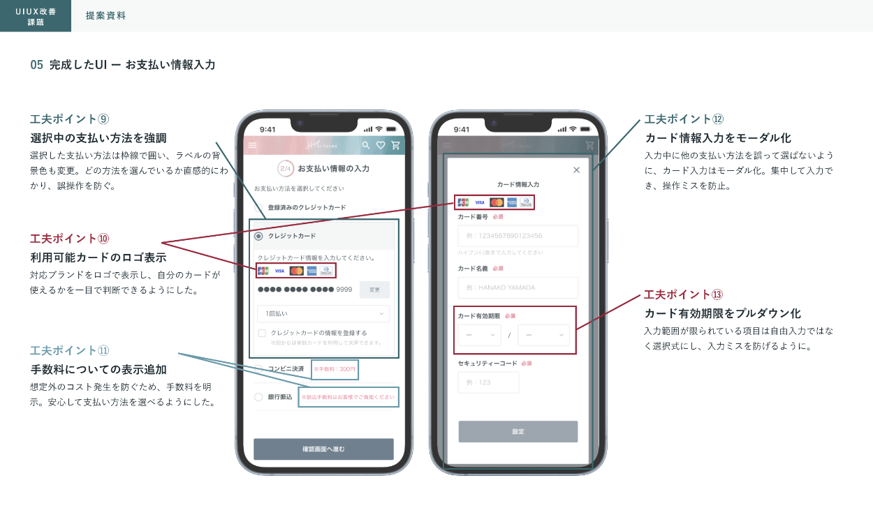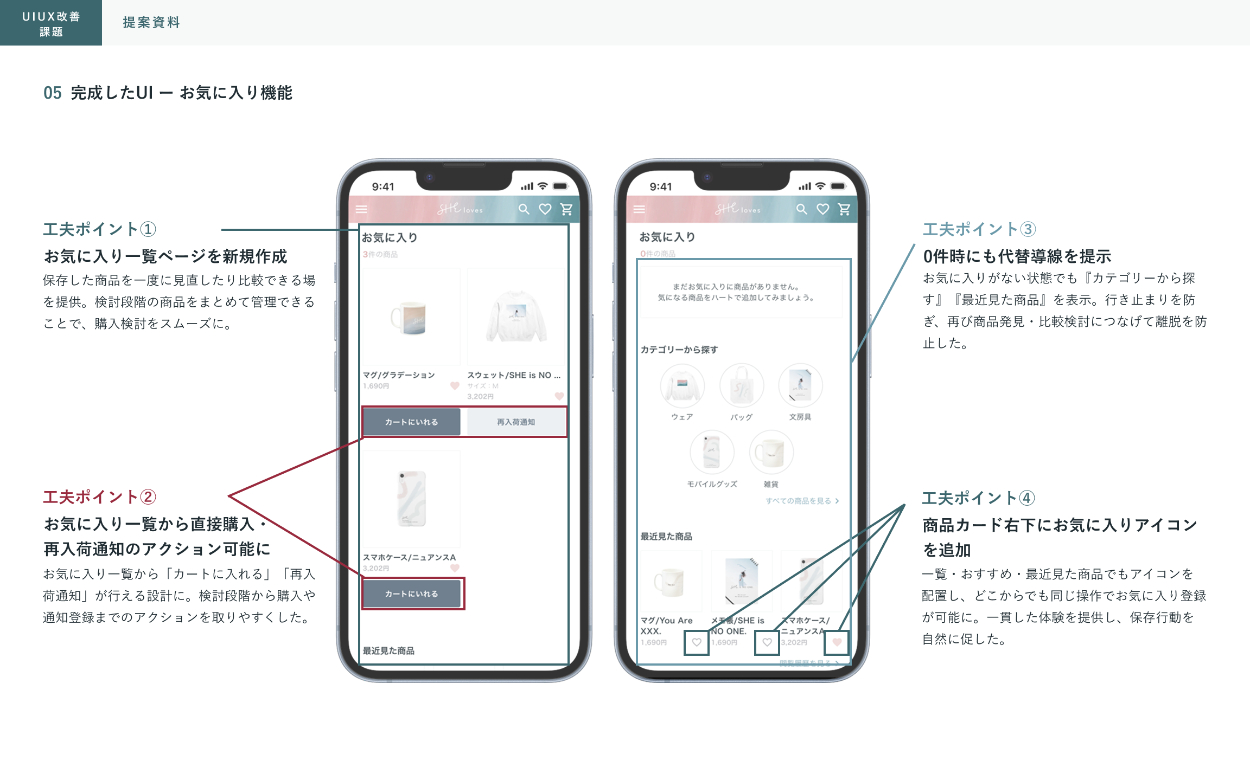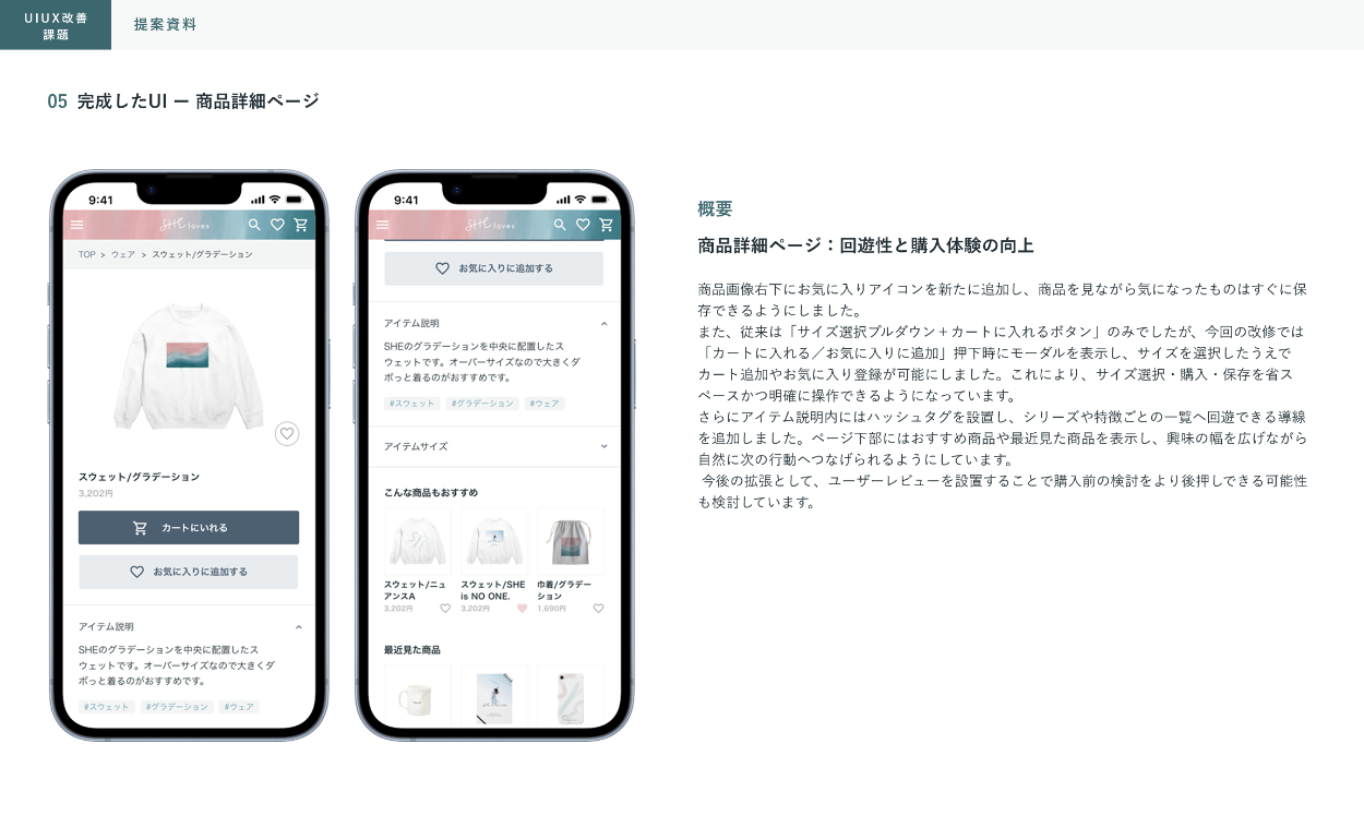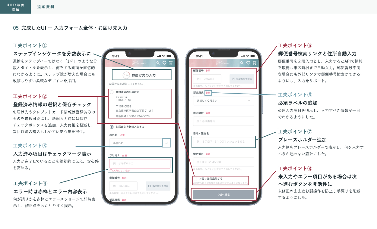 SHElikes PRO デザイナーコースの課題。 「入力フォームで途中離脱が多い」「ほしい商品が見つけづらく離脱してしまう」というECサイトの課題に対し、要因を分析し、UI/UX改善を行いました。Figmaでのプロトタイプ作成と提案資料へのまとめを実施しました。