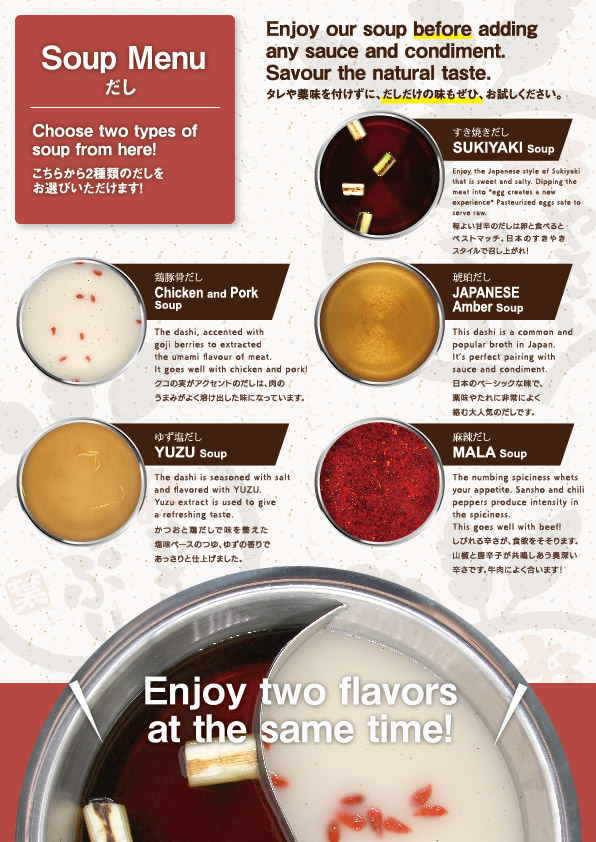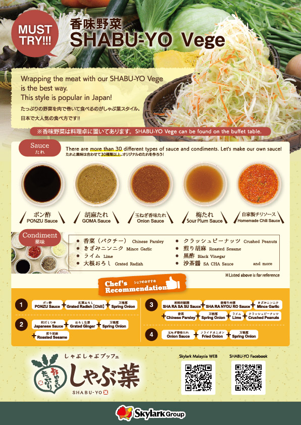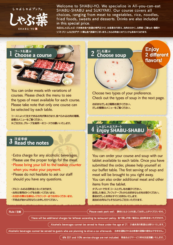 Mega Global Media Sdn. Bhd. provided support to Shabuyo, a shabu-shabu restaurant owned by Skylark Holdings, a major restaurant chain group in Japan, when it expanded into Malaysia. My role was to take promotional photos of the ingredients and food, and to propose menu designs that would suit their brand's art direction.