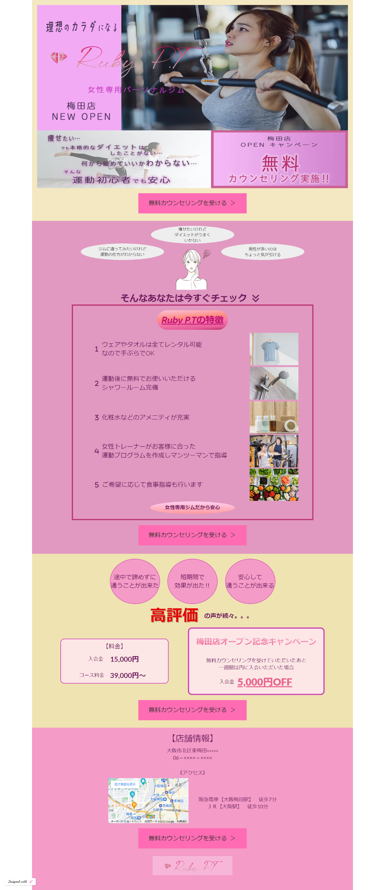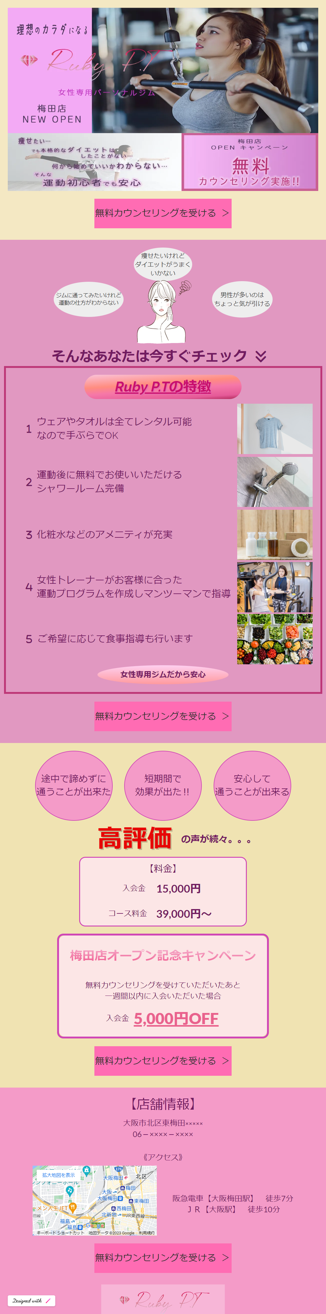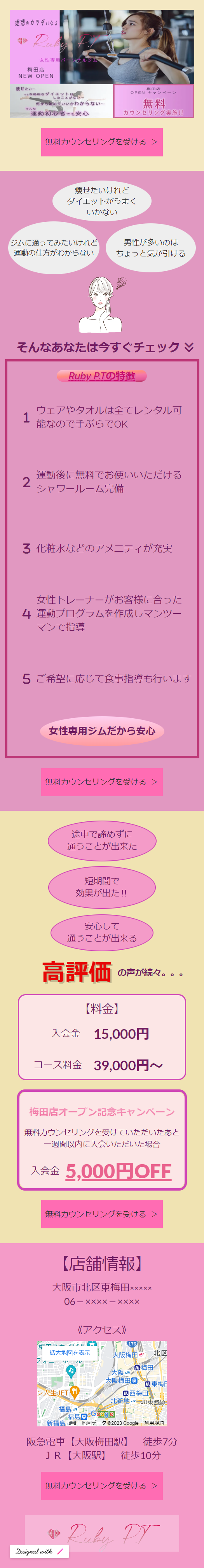 希望に合わせてピンクを基調に作成しました。一度試してみたいと思ってもらえるようにテキストと写真を並べ、きちんと整えることで清潔感も感じられるようにしました。