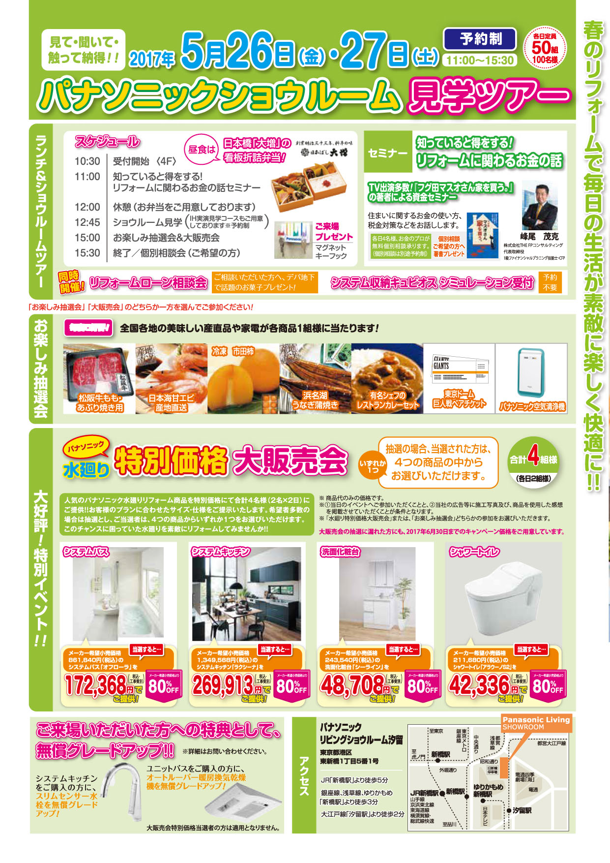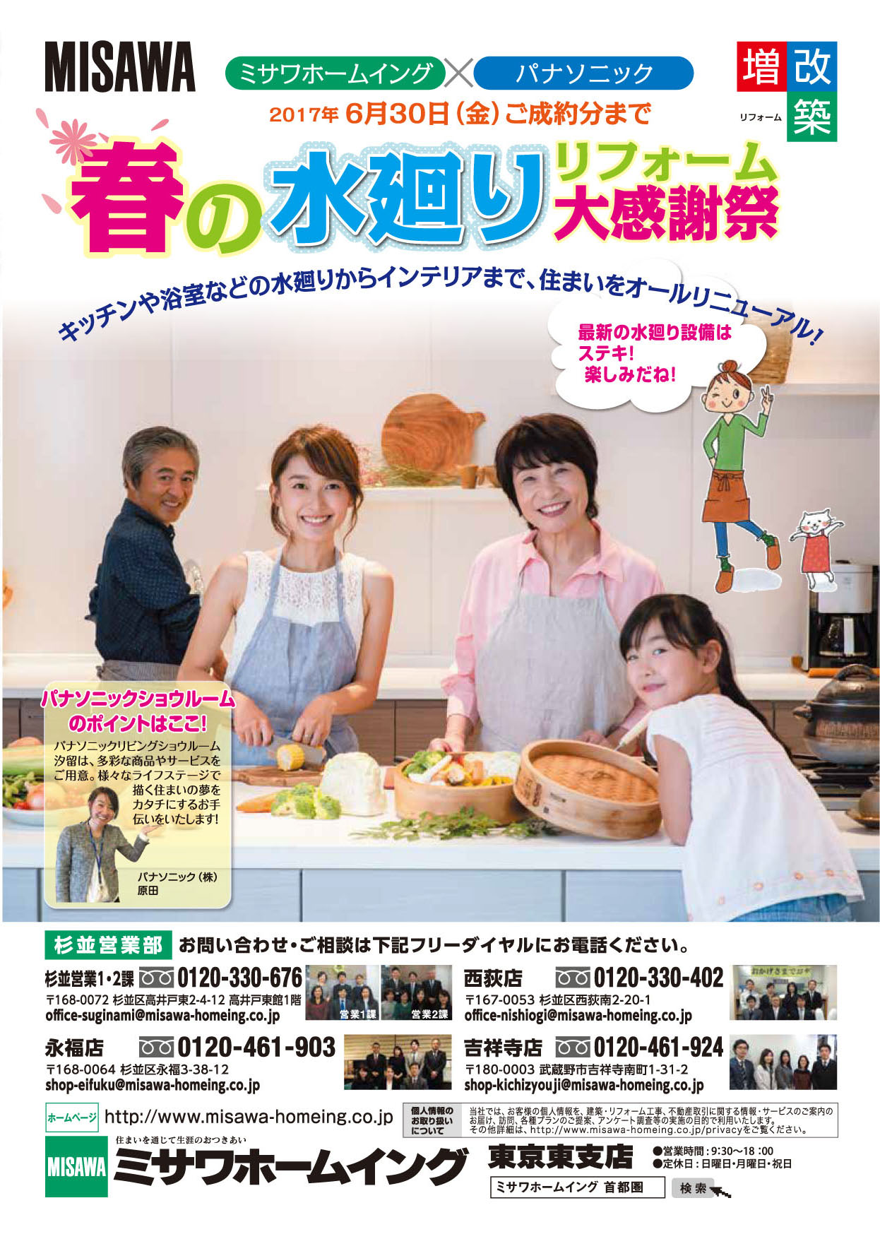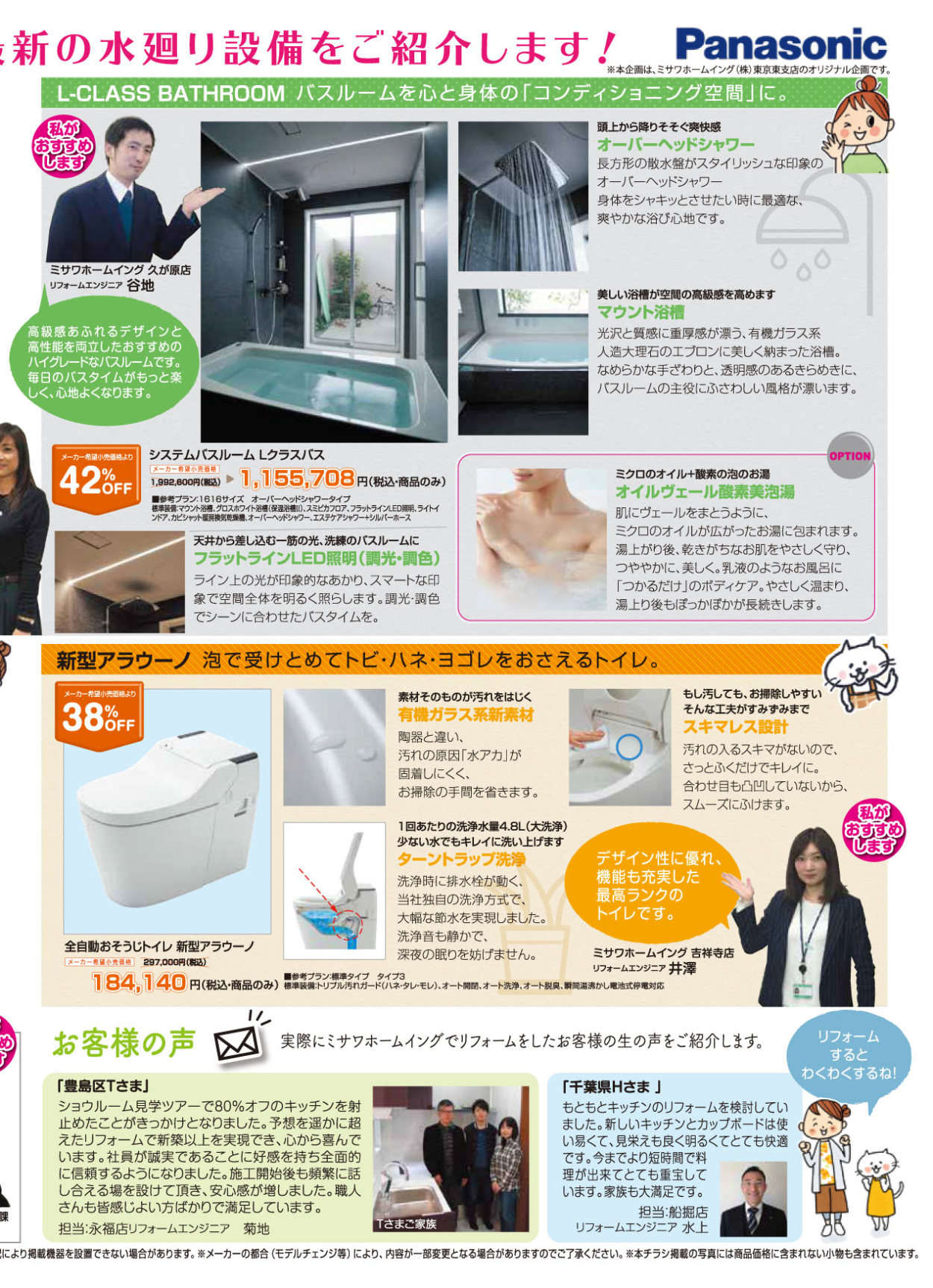 住宅メーカーとリフォーム会社のコラボキャンペーンリーフレット。イベント風に楽しいもの、ファミリー向けの賑やかなPOPなイメージにしてほしいという要望があり、アイテム数も多かったために商品の説明とのバランスを考えてデザインしました。
