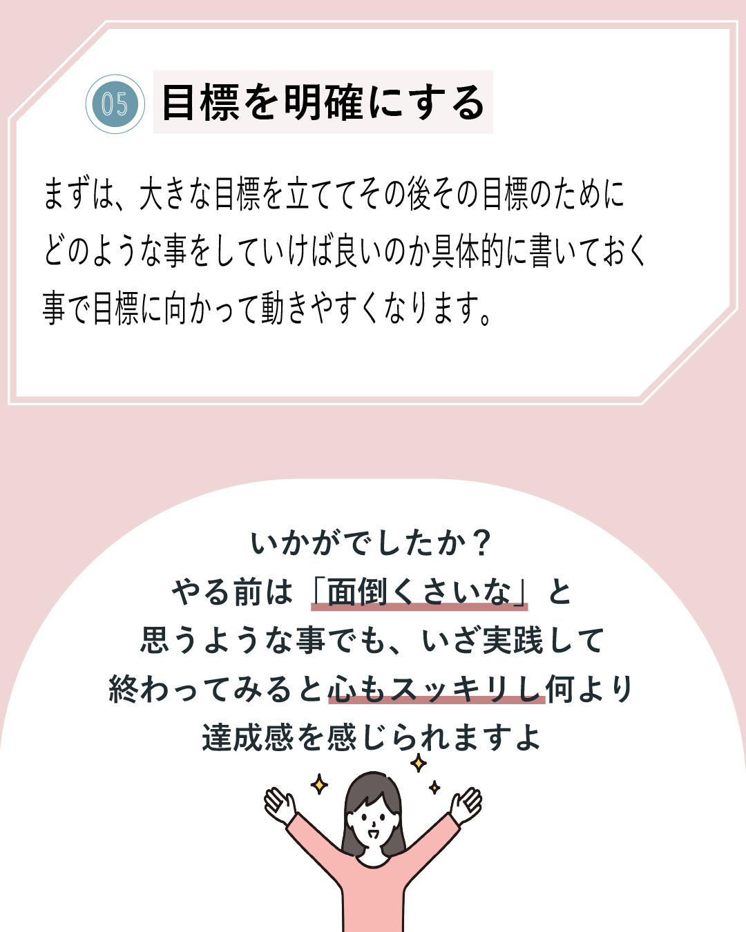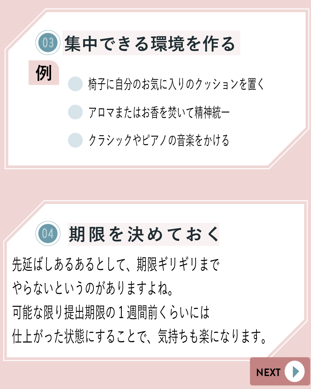 2項目ずつに分け、読み手が取り入れやすいような内容とデザインでまとめました。