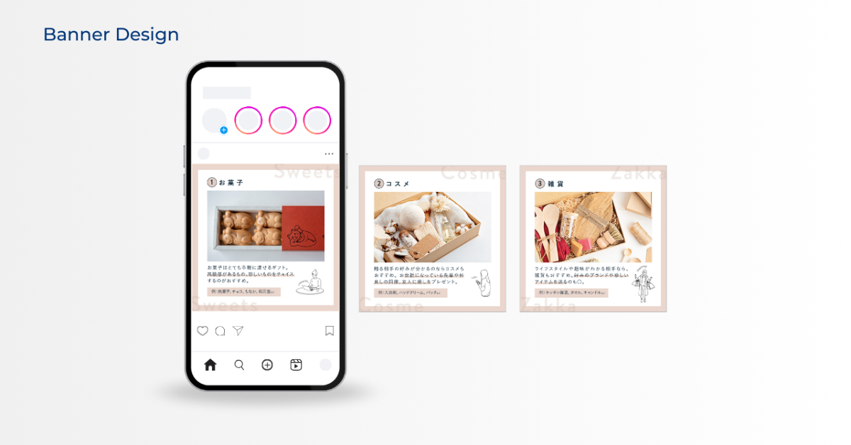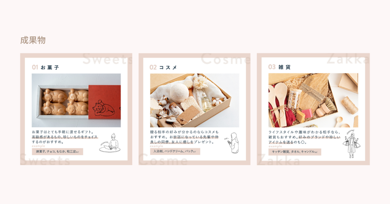 - ギフトを贈る行為、贈られる行為が「あたたかな気持ち」になるイメージで暖色系にした。贈るハードルが低い順にお菓子→コスメ→雑貨にした。