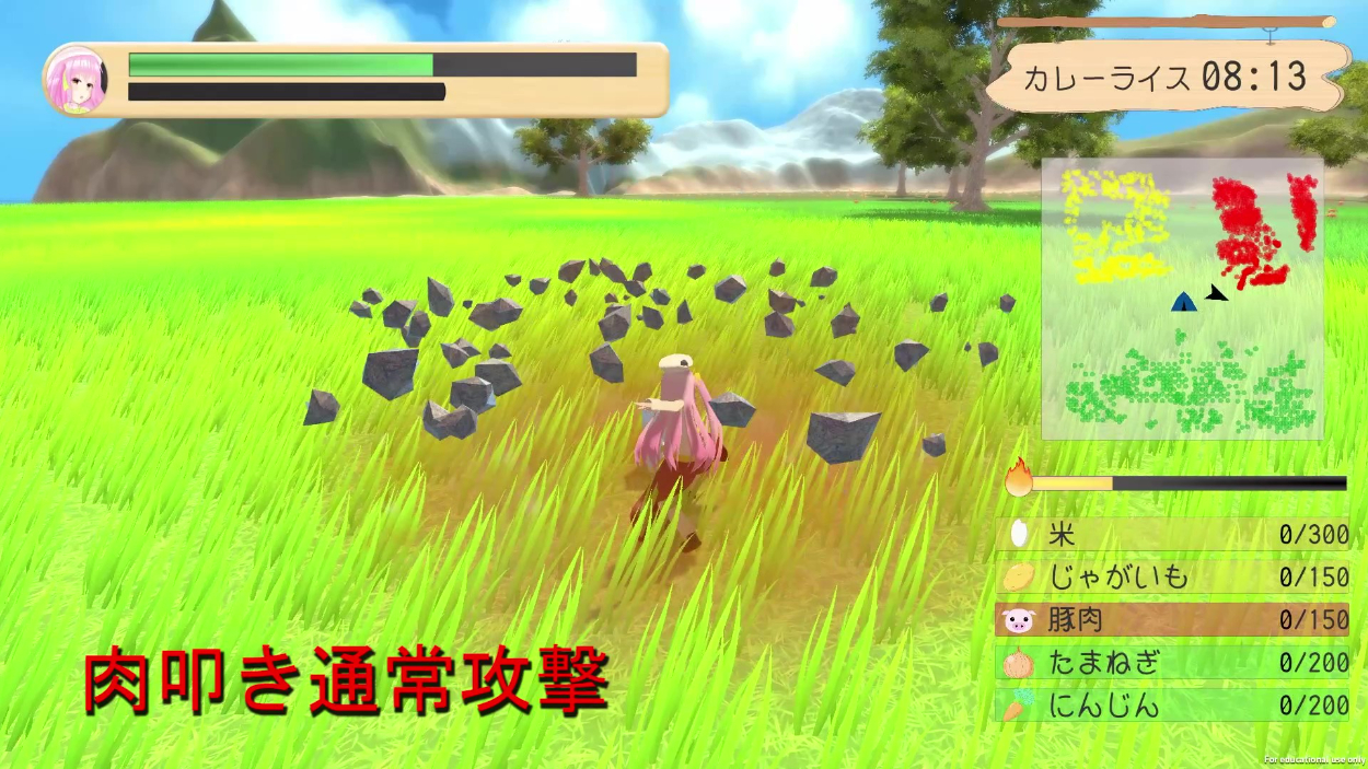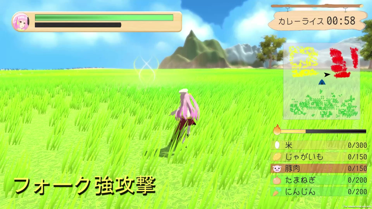 制作感想:ゲーム内の攻撃エフェクトを制作しました。武器によって攻撃モーションが変わるのでモーションにあったエフェクトを制作しました。特にフォークの必殺技、肉叩きの必殺技に力を入れました。