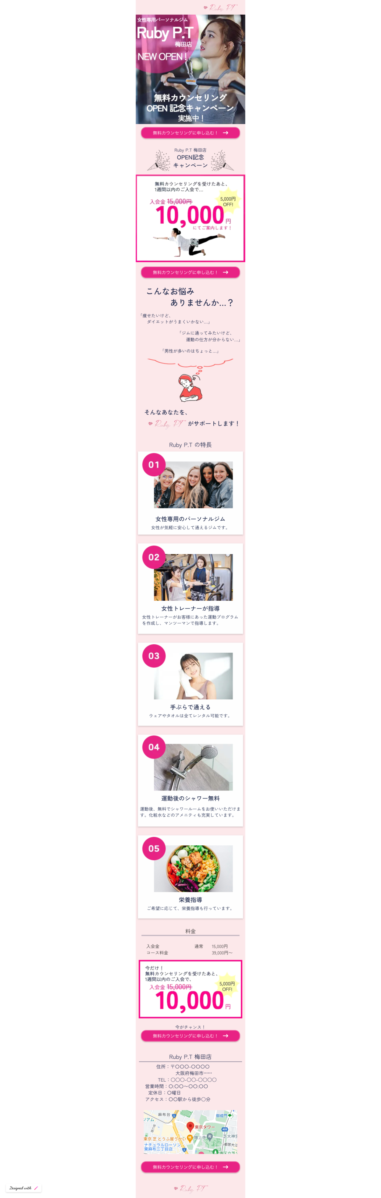 ・女性専用のパーソナルトレーニングジムです。新店舗をオープンするので、無料カウンセリング受付中告知のLP作成をお願いいたします。