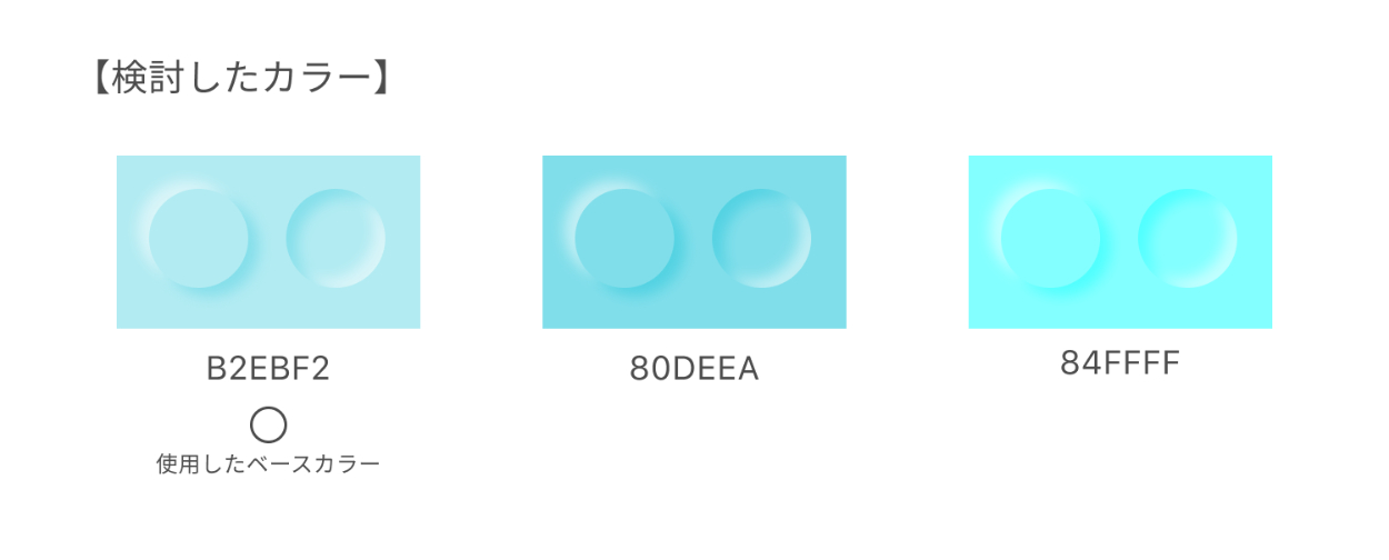 検討したカラー3つのうち、明るくてニューモーフィズムデザインでも見やすい「B2EBF2」を選定しました。