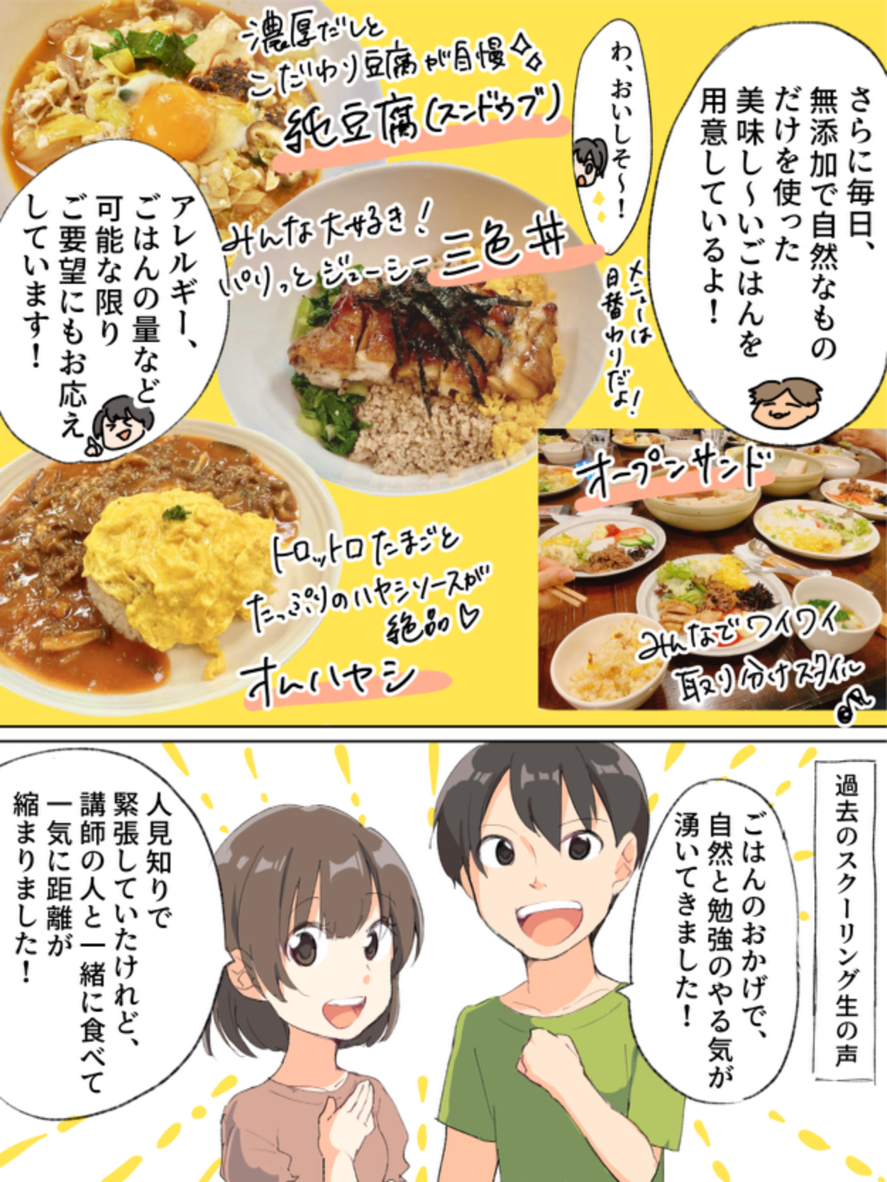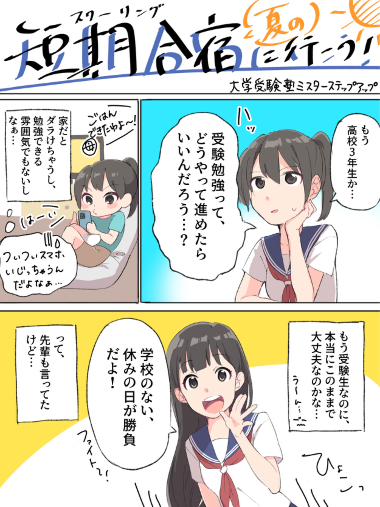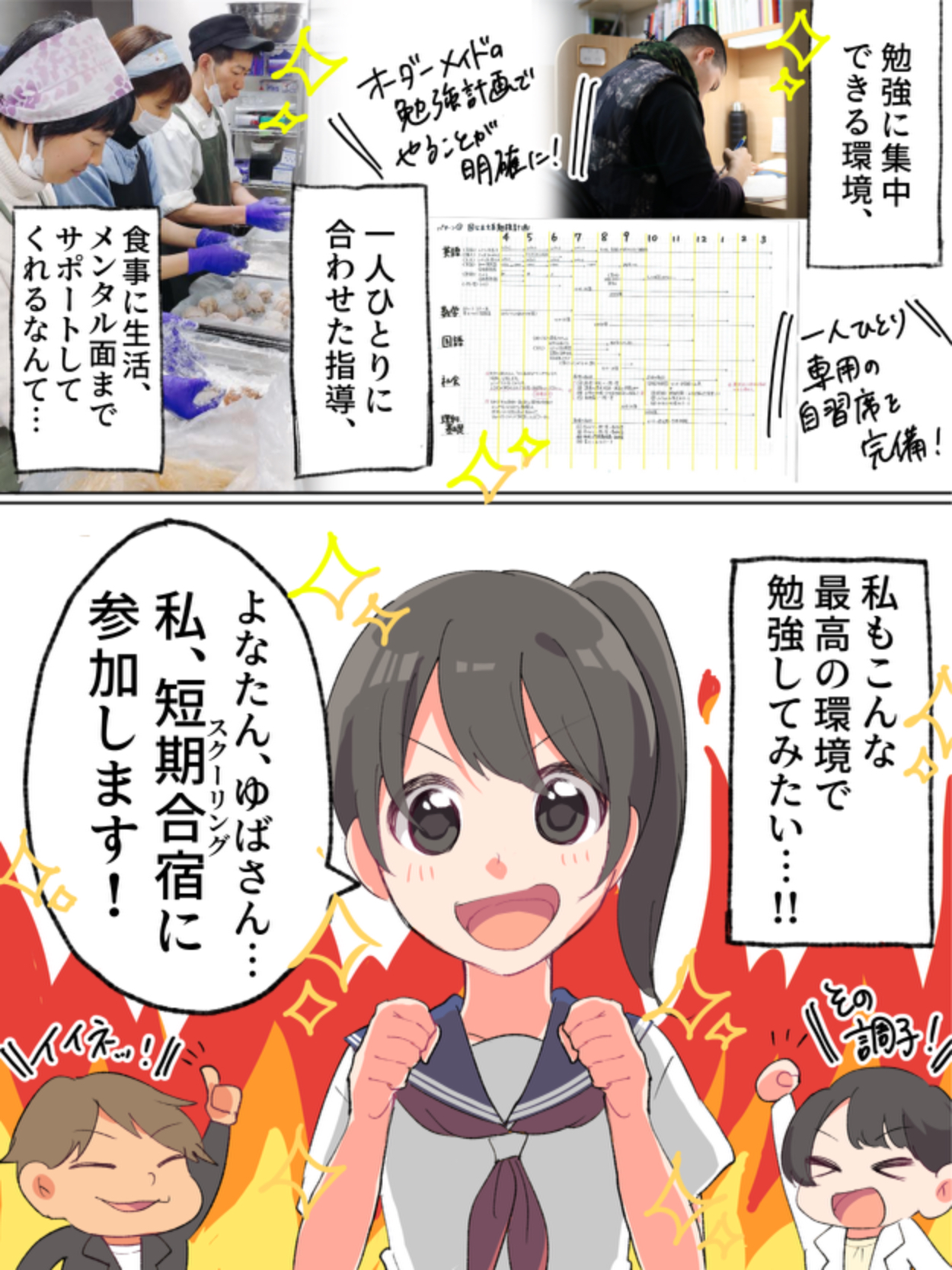 PR漫画 新保日南 OVERVIEW アルバイト先の塾の短期合宿PR漫画を描かせていただきました。 ターゲット:高校生、浪人生 YEAR 2023 ◉制作期間1ヶ月◉気をつけたポイント必要事項(コース、食事、指導内容など)を簡潔にまとめるよう心がけました。また、写真を取り入れることで塾で過ごしている様子をイメージさせやすくしました。