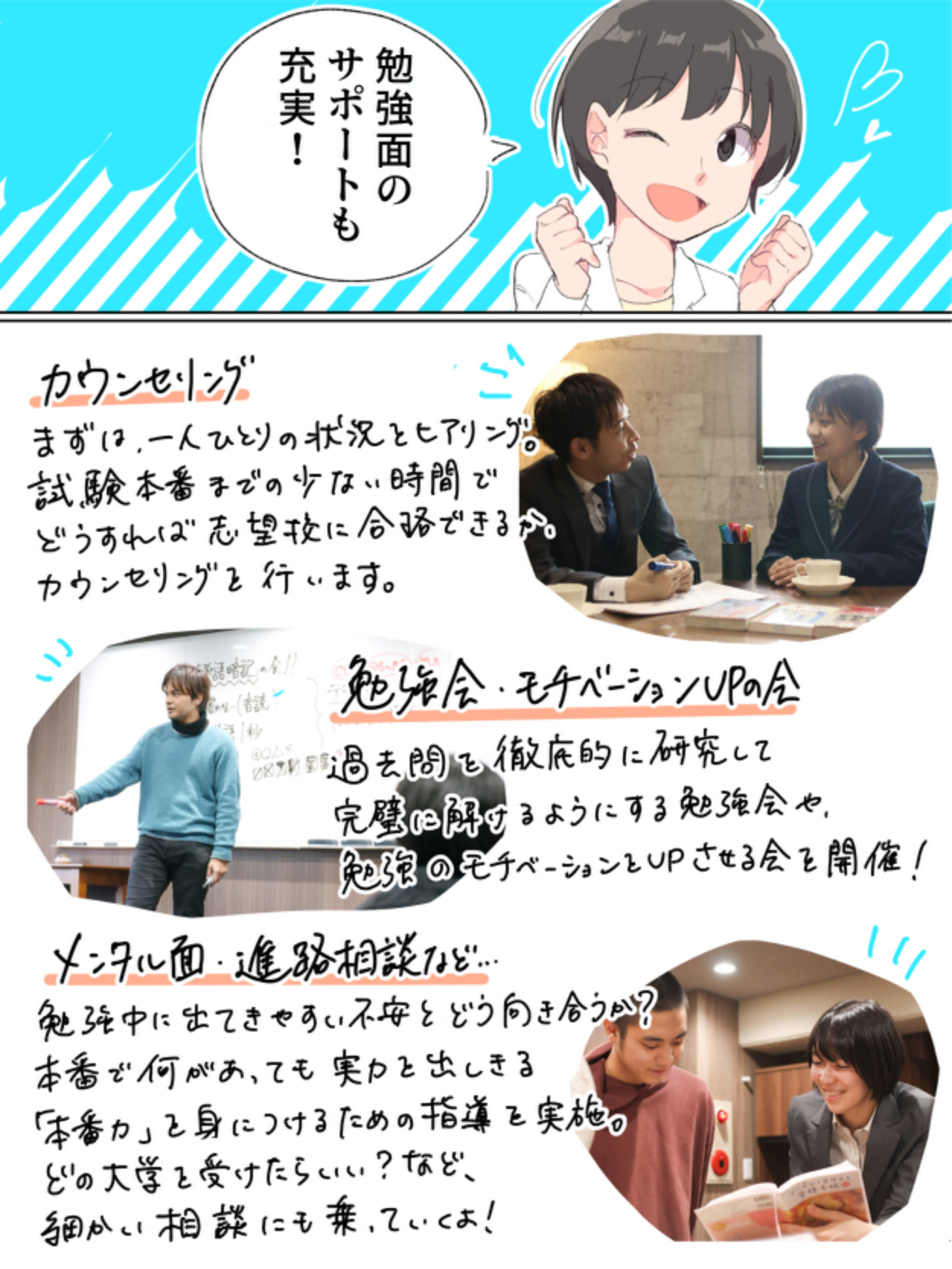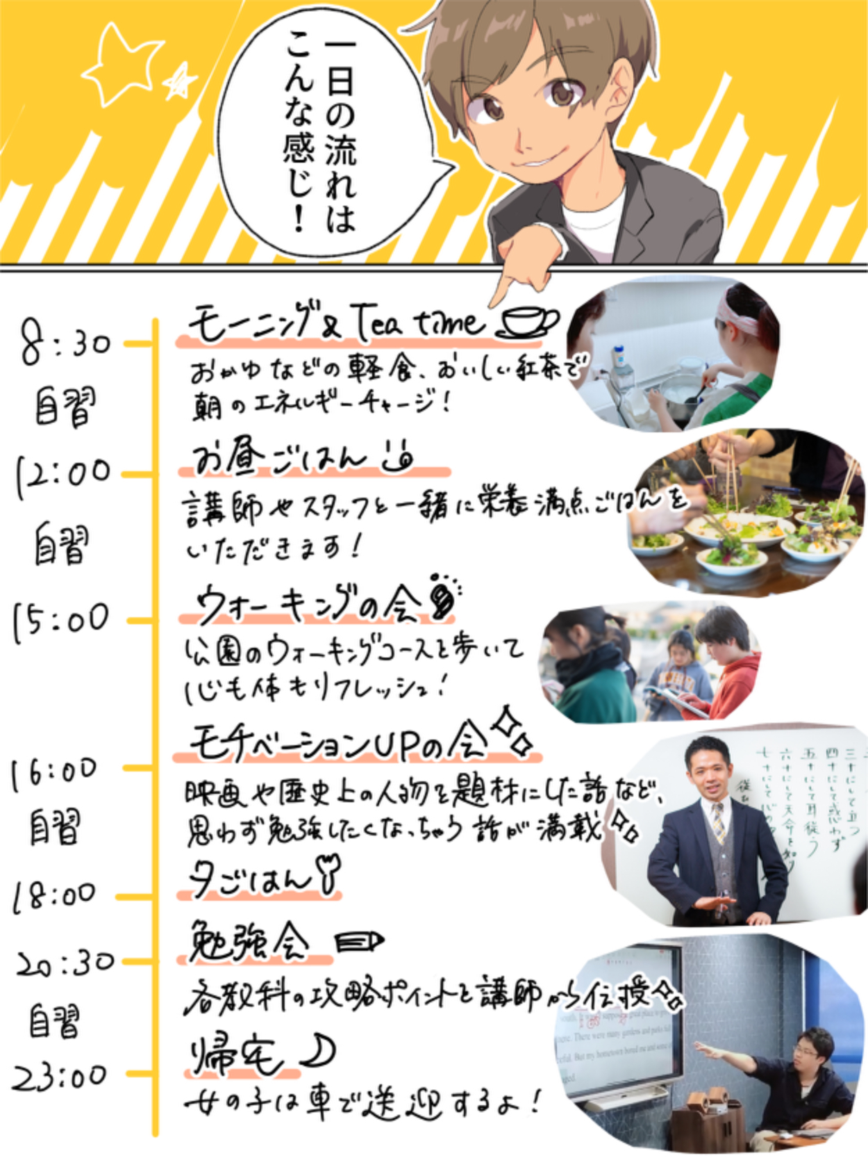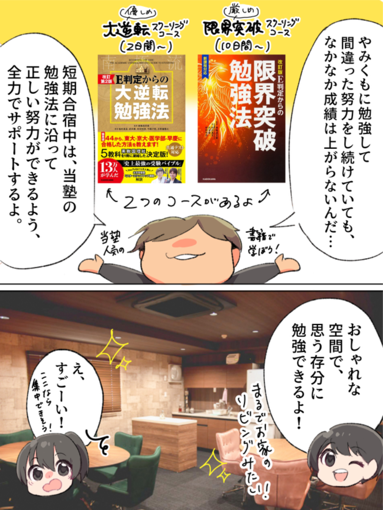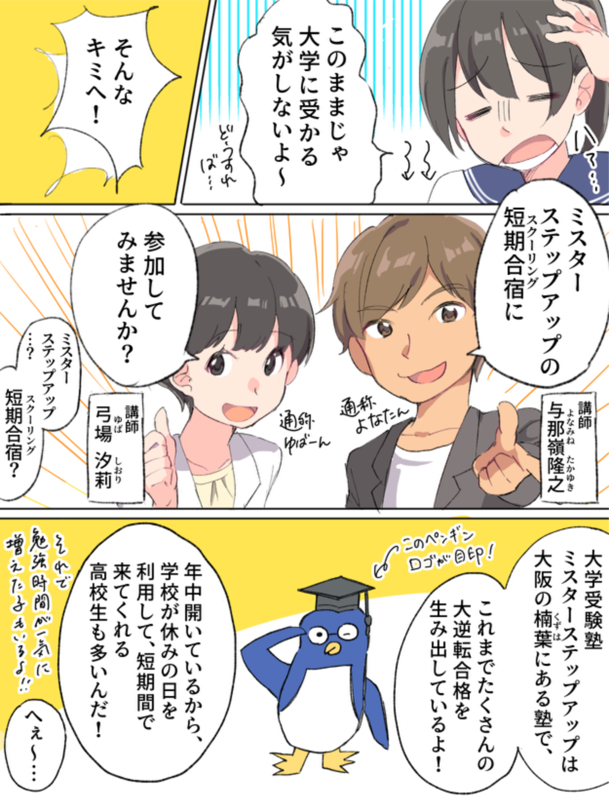 PR漫画 新保日南 OVERVIEW アルバイト先の塾の短期合宿PR漫画を描かせていただきました。 ターゲット:高校生、浪人生 YEAR 2023 ◉制作期間1ヶ月◉気をつけたポイント必要事項(コース、食事、指導内容など)を簡潔にまとめるよう心がけました。また、写真を取り入れることで塾で過ごしている様子をイメージさせやすくしました。