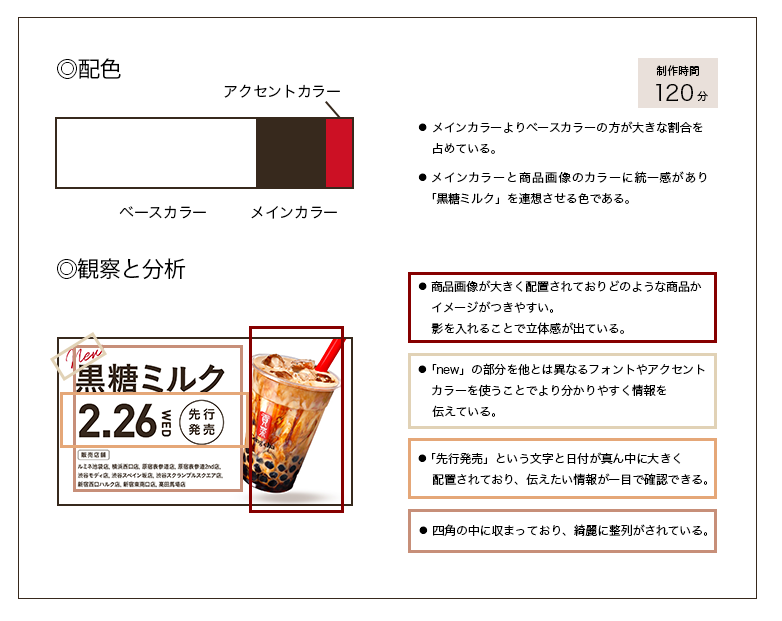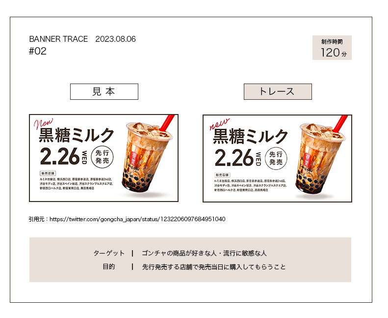 SHElikes MULTI CREATOR PROJECTにて、バナートレースに取り組みました。目的・ターゲット・配色・観察と分析の結果をまとめました。(制作時間:トレース120分/まとめ90分)