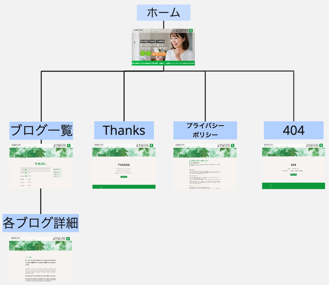 6ページ(ホーム、ブログ一覧ページ、各ブログ詳細ページ、プライバシーポリシーページ、Thanksページ、404ページ)